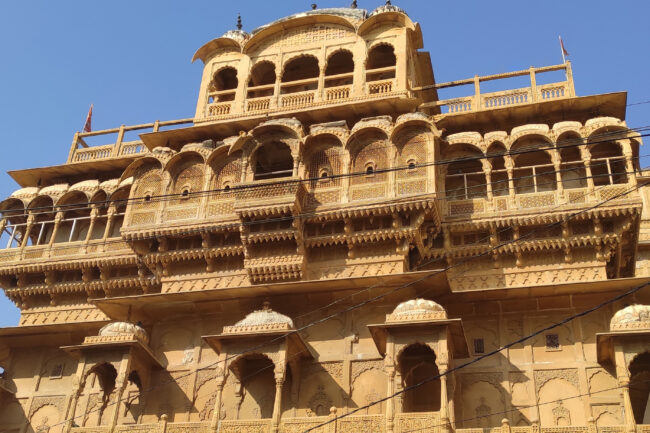 Intentad ir en temporada baja, cuando el turismo no sea excesivo, y podréis viajar con vuestra imaginación a través del tiempo, al compás de sus edificios. Jaisalmer tiene muchos monumentos que ver. ‘Sonar Quila’, la fortaleza dorada en bengalí, es el bastión que domina la ciudad desde lo alto, para llegar hasta ella tendrás que andar callejeando mientras subes una larga cuesta, llena de puestos por el camino donde comprar, ropa, telas, especias y cuadros entre muchas cosas. Un gran arco os dará la bienvenida al fuerte pero una vez entréis os daréis de bruces con la realidad y la gran fortaleza perderá su encanto por la cantidad de puestos de suvenires que pululan entre sus callejuelas. El truco para volver al pasado es que miréis hacia arriba, a sus ornamentados arcos, a sus ventanales y figuras de otra época y volveréis a estar en sintonía con vuestra imaginación. Ojos que no ven…corazón que vuela.