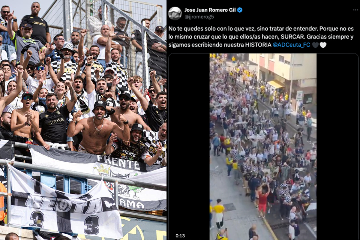 El técnico de la AD Ceuta, José Juan Romero, ha compartido un vídeo de su afición destacando el empuje que le dieron y agradeciendo su esfuerzo. “No te quedes solo con lo que ves, sino tratar de entender. Porque no es lo mismo cruzar que lo que ellos hacen, surcar. Gracias siempre y sigamos escribiendo nuestra historia”, escribió el técnico.