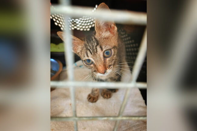 Kai, un pequeño cachorro de gato que ya ha sufrido el abandono. Fue encontrado solo en la calle, temblando y hambriento, pero su rescate no ha supuesto una mejora: actualmente vive en un transportín en la perrera de Ceuta, “sin espacio para moverse y sin las condiciones mínimas de bienestar”, según denuncian desde Chats Noirs.