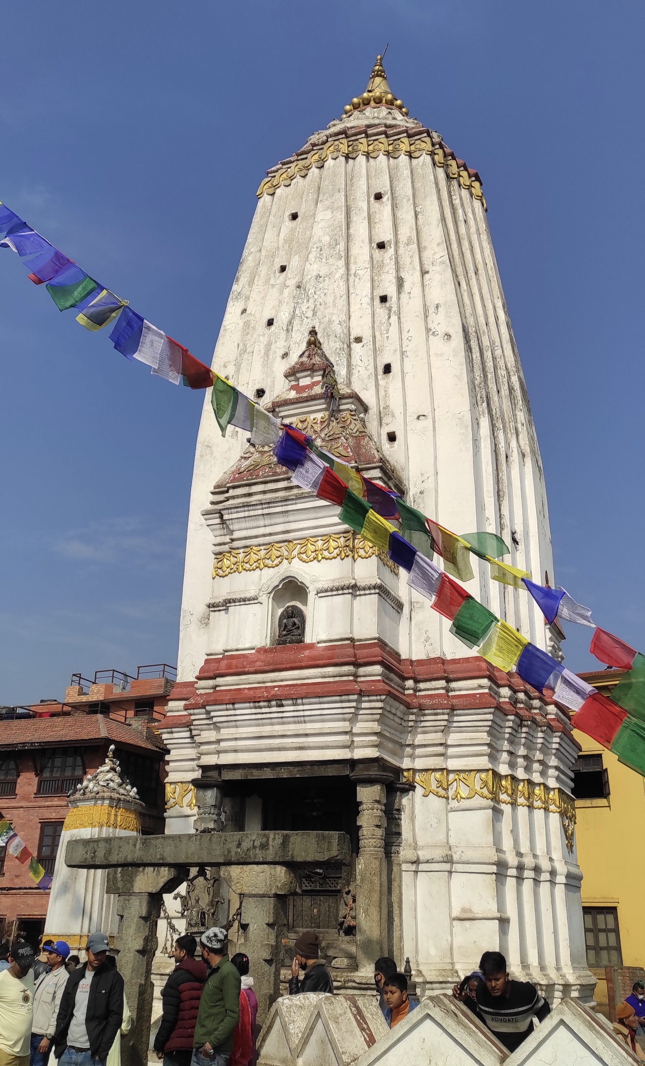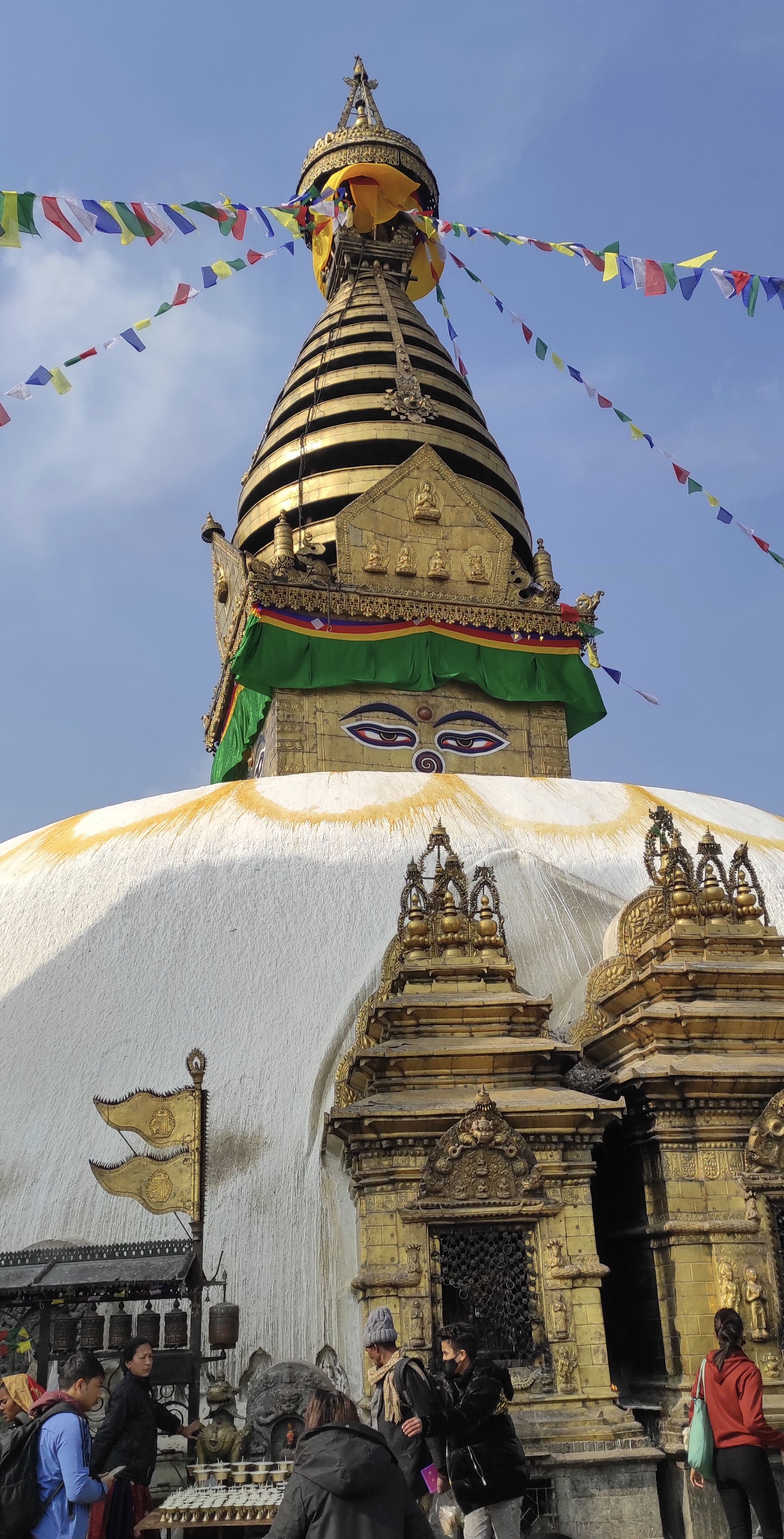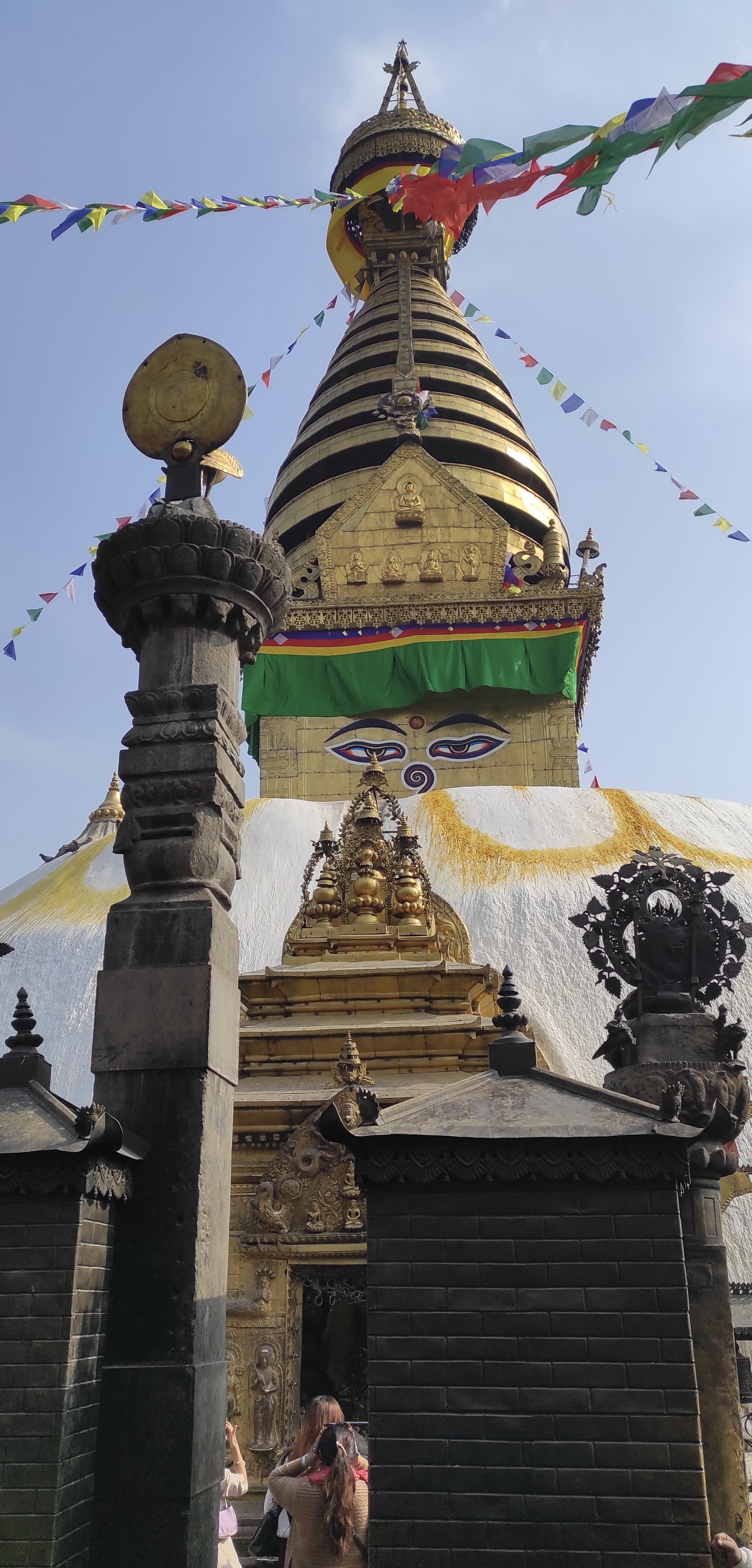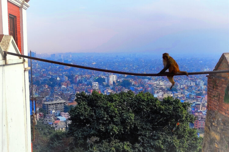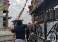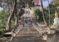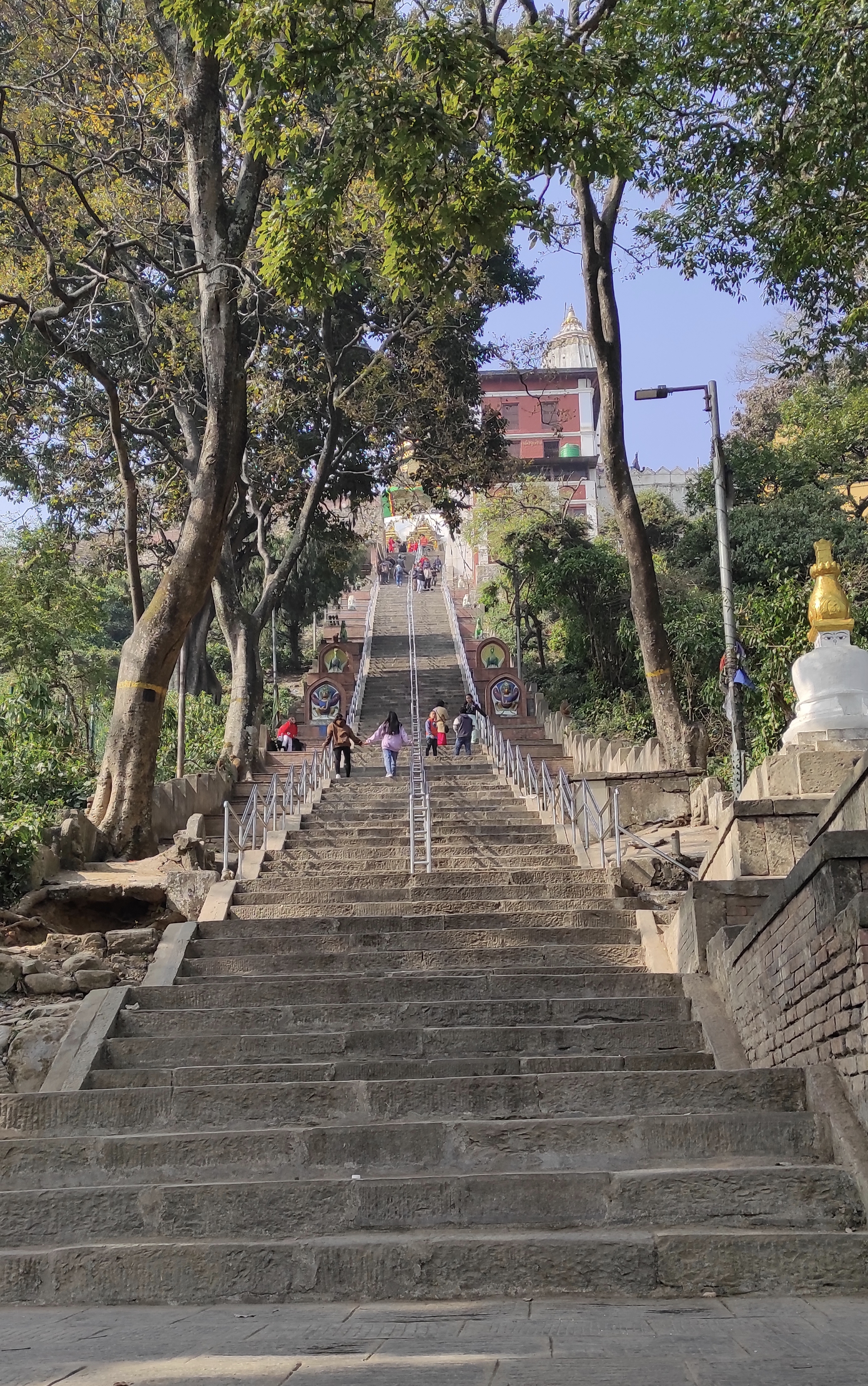 Al oeste de Katmandú se encuentra Swayambhunath, o más conocido como el templo de los monos, mi templo preferido de la capital tiene dos entradas, una que se llega con vehículo desde el norte y la entrada sur que te cobrará subir trescientos sesenta y cinco escalones que se van haciendo más duro a partir la mitad de la subida ya que el ángulo de la pendiente se hace más pronunciada a medida que vas subiendo.