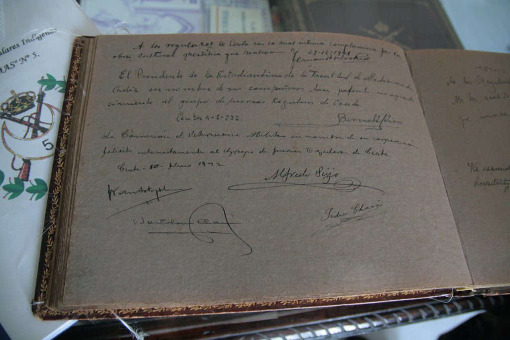 “A los regulares de Ceuta con la más íntima complacencia por la obra cultural y estética que realizan”. Esta es la dedicatoria, firmada por el ministro Fernando de los Ríos, que aparece en el libro de visitas que los Regulares en 1931.