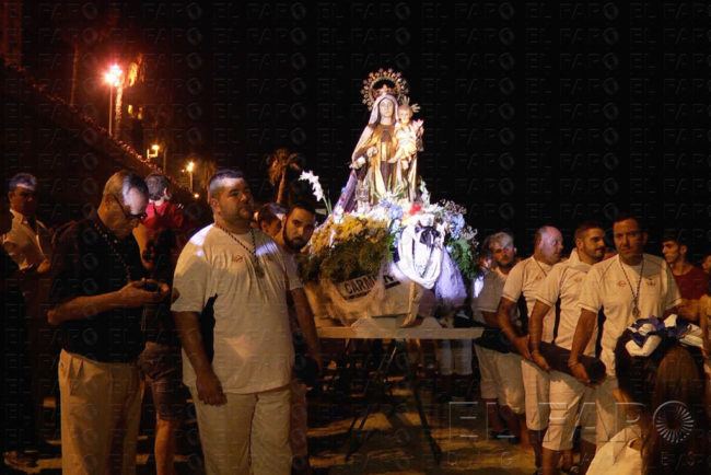 A las nueve de la noche los costaleros de la Asociación Hijos Nuestra Señora del Carmen sacaban sobre sus hombros a la Virgen bajo los sones del Himno Nacional y ‘La salve marinera’, interpretada por la Asociación Banda Cultural de Música Ciudad de Ceuta. Sencillamente decorada con helechos y numerosos ramos de flores donados por los fieles, recorrió las calles arropada por los devotos, tanto niños como mayores, muchos de ellos visiblemente emocionados y con vítores de ¡Viva la Virgen del Carmen! y ¡Guapa, guapa y guapa!.