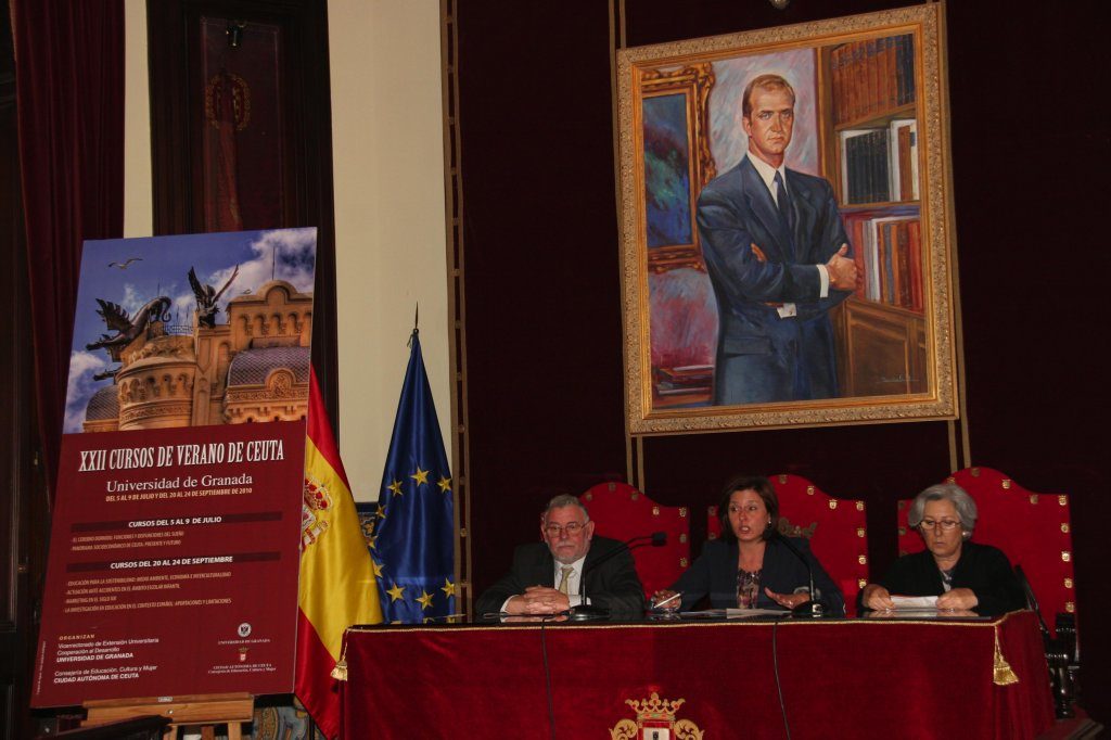 Unos cursos más centrados en aspectos de Ceuta fue lo principal de la presentación de la XXII edición de los Cursos de Verano de la que se encargaron la consejera de Educación, Cultura y Mujer, Mabel Deu; el vicerrector de Extensión Universitaria y Cooperación al Desarrollo de la Universidad de Granada (UGR), Miguel Gómez Oliver; y la directora de los cursos, Carmen Villaverde.