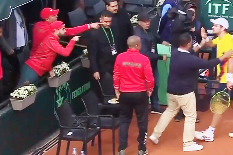 Nicolás Mejia dio el tercer y definitivo punto a Colombia frente a Marruecos, en la eliminatoria de clasificación del Grupo Mundial I de la Copa Davis, y la tensión se desató en la grada, con el lanzamiento de botellas a la cancha, y en el recinto de juego con el enfrentamiento y reproches entre ambos equipos.