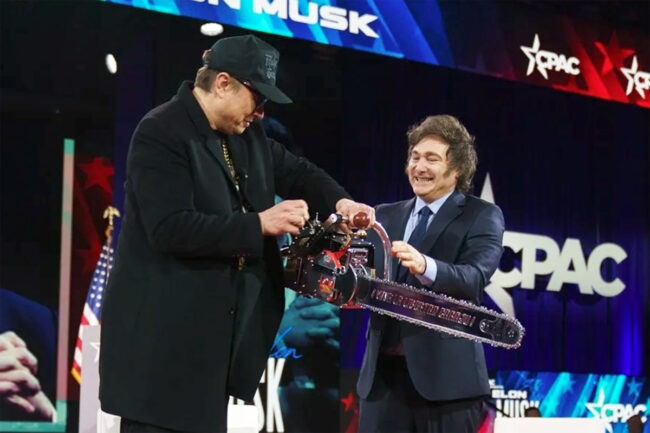 Ha sido bochornoso el espectáculo montado por Elon Musk y su amigo Milei en la cumbre ultra de la Conferencia Política de Acción Conservadora (CPAC). No solo porque el hombre más rico del mundo ha mostrado con agrado el regalo del presidente de Argentina, sino porque ha hecho ostentación de los recortes que están llevando a cabo en el Estado de Bienestar de sus respectivos países.