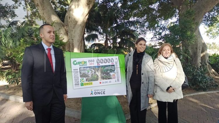El director de la ONCE en la ciudad autónoma, Azmán Abdalahe, ha presentado la imagen de este cupón junto a la consejera de Sanidad y Servicios Sociales, Nabila Benzina, en un encuentro que ha tenido lugar en los Jardines de Argentina en donde se encuentra ese árbol.