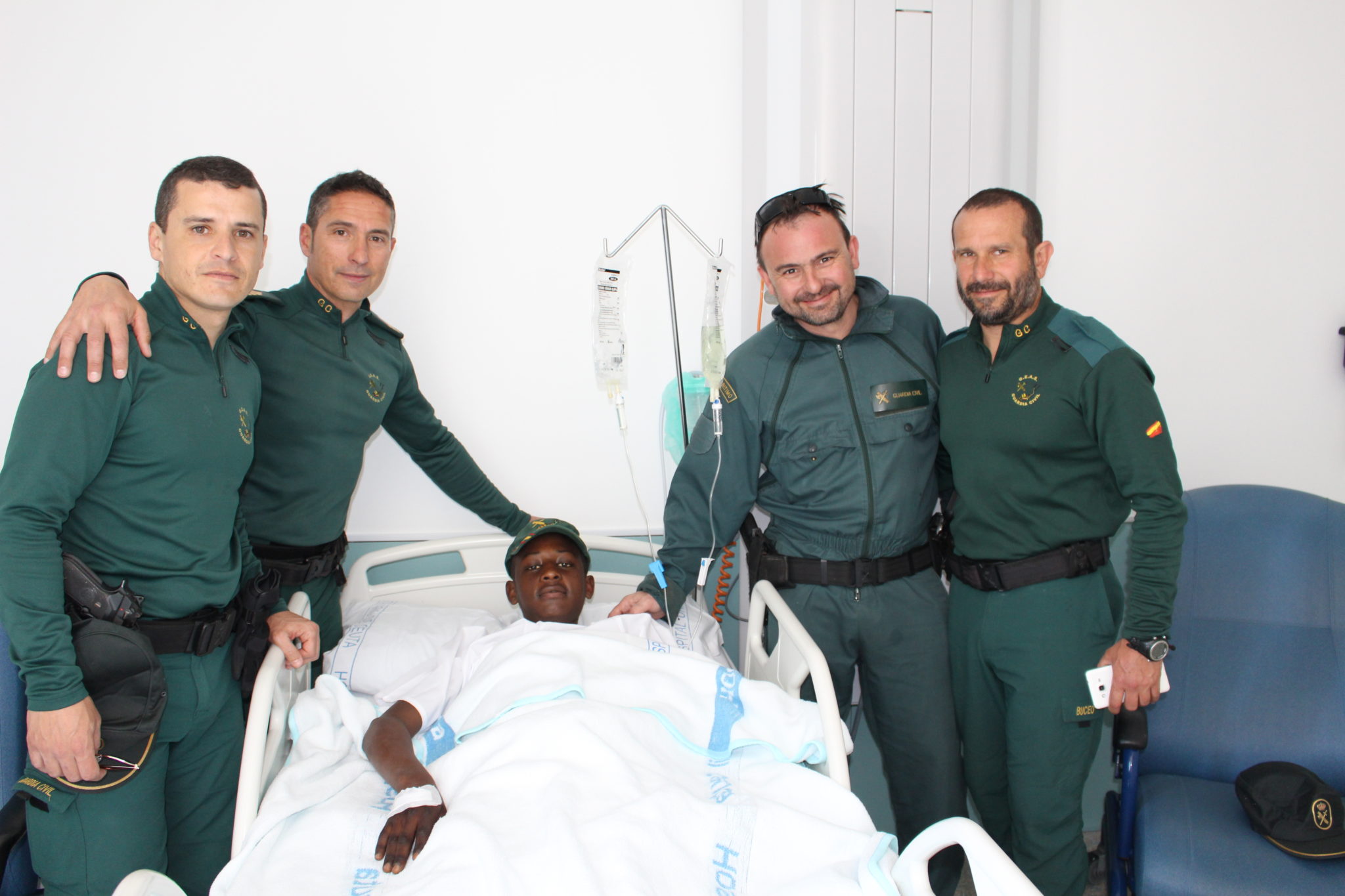 En la mañana de hoy los componentes del GEAS y Servicio Marítimo, que participaron ayer en el rescate del joven que cayó al agua desde la patera, han querido conocer e interesarse por el estado de S.B., dado que en distintos momentos de su rescate tuvieron una gran sensación de impotencia y temor de que pereciera ahogado, circunstancia esta que por la profesionalidad, preparación y constancia de los agentes se saldo con el mayor reconocimiento al salvar una vida humana.