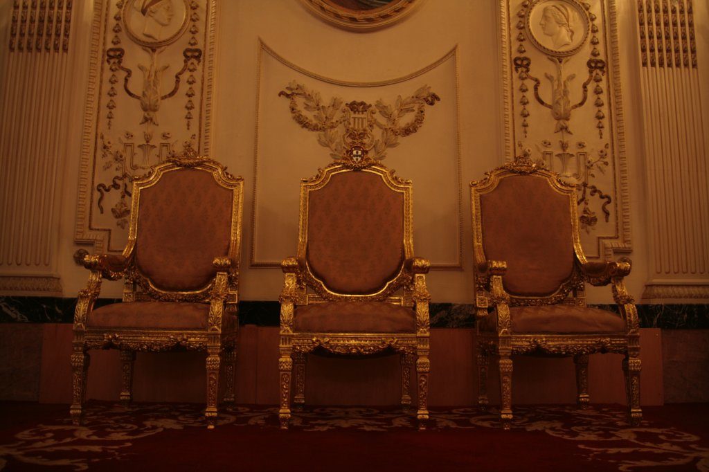 Se trata de tres asientos de época alfonsina, inaugurados en el año 1923 y que habían sido realizados según el gusto más lujoso de la época. En aquella época, tanto los tronos como el resto de sillas del salón del trono tuvieron un uso activo. Cabe destacar la ocasión en la que el rey Alfonso XIII en persona cenó en aquella sala compartiendo mesa con Millán Astray, fundador de la Legión.