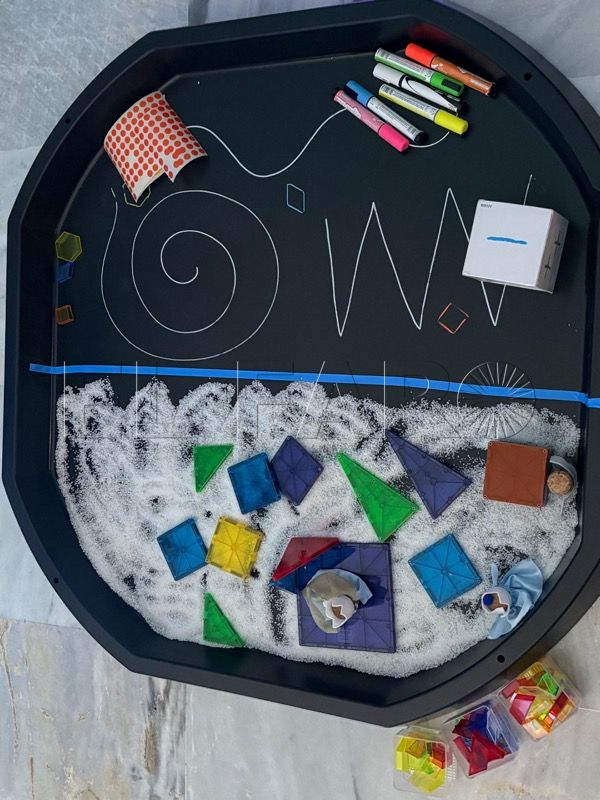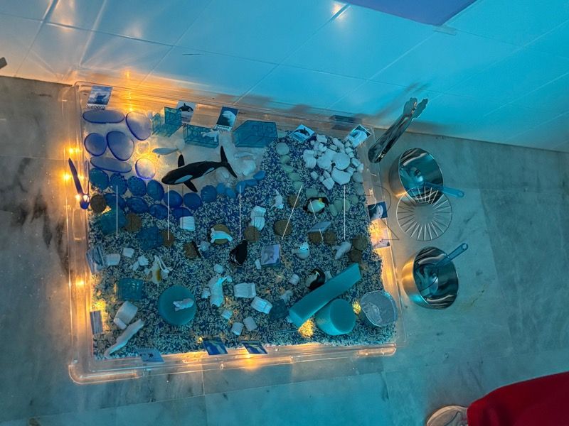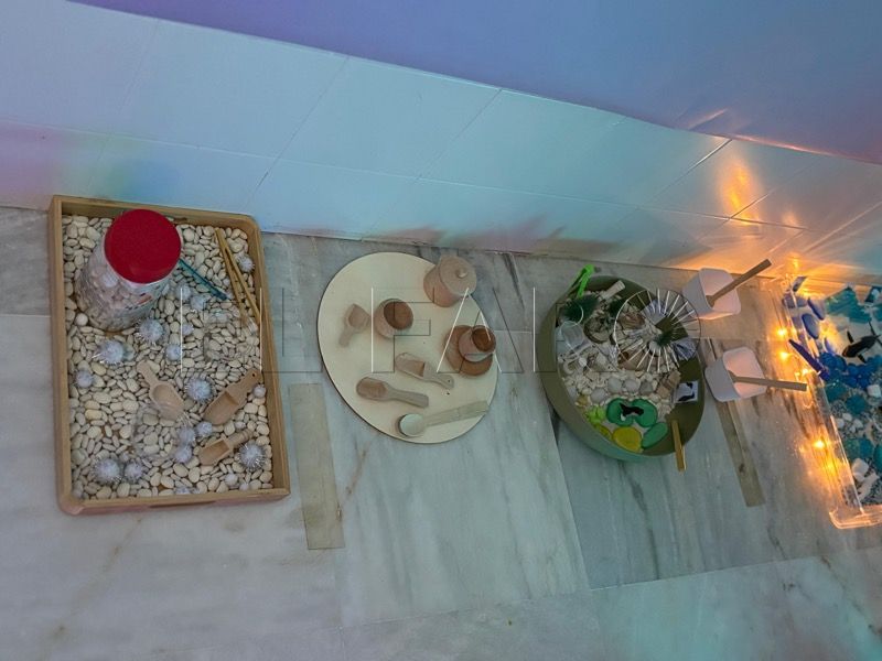 Entre los materiales utilizados destacan bases sensoriales naturales como arroz, macarrones o avena. Entre los espacios se aprecian mini mundos temáticos del océano y de la tierra con animales del invierno y areneros que permiten la experimentación táctil.