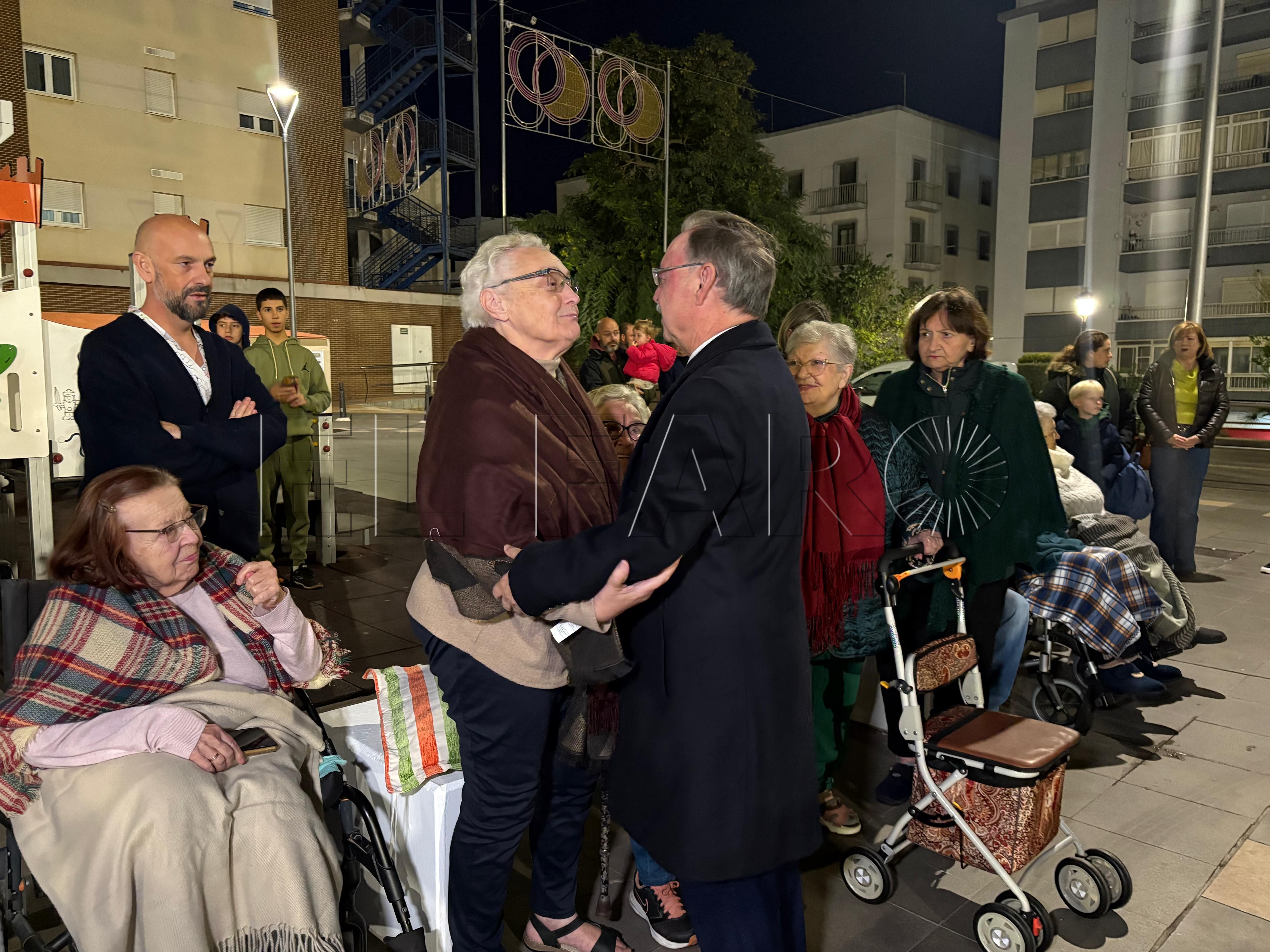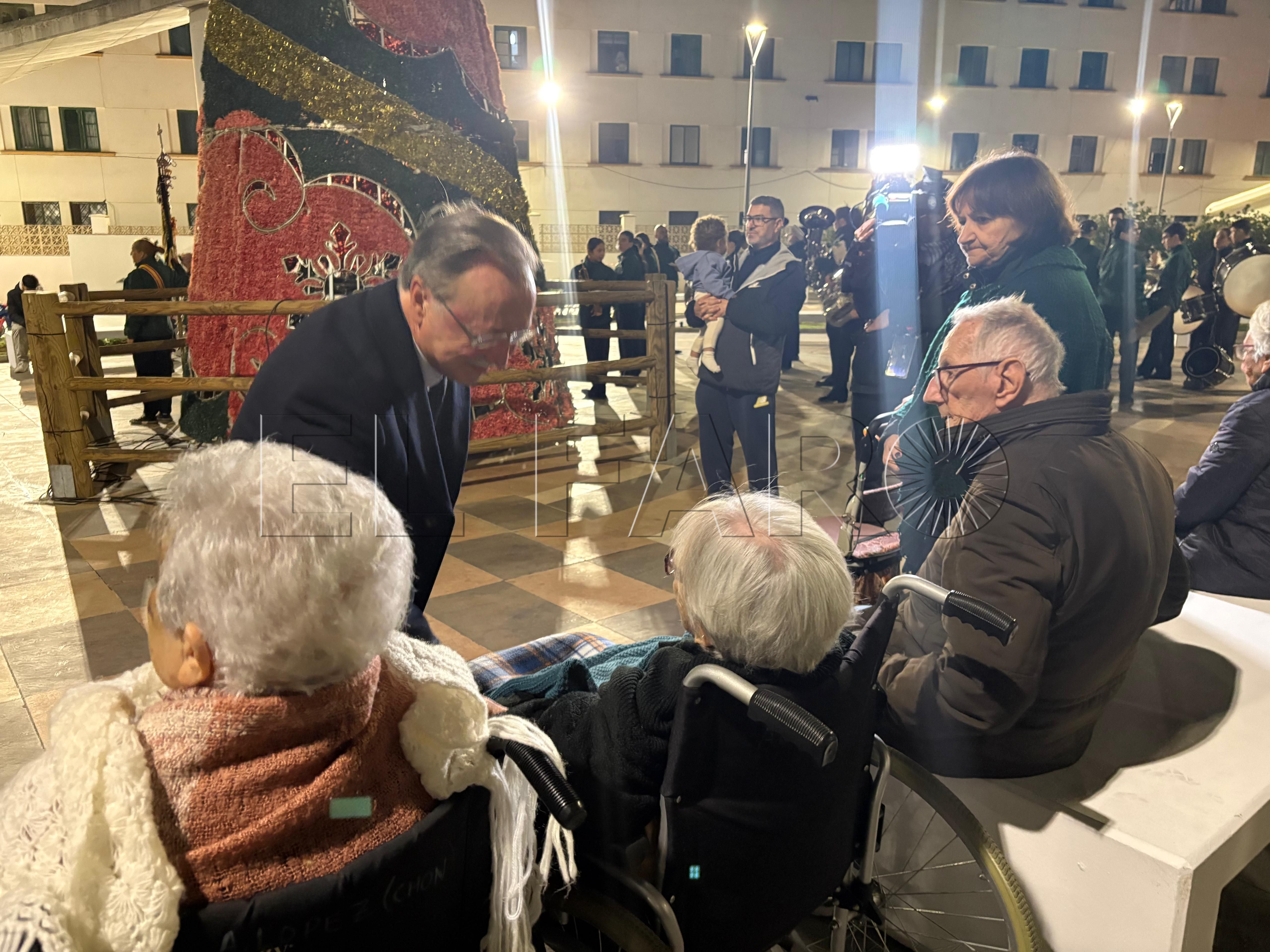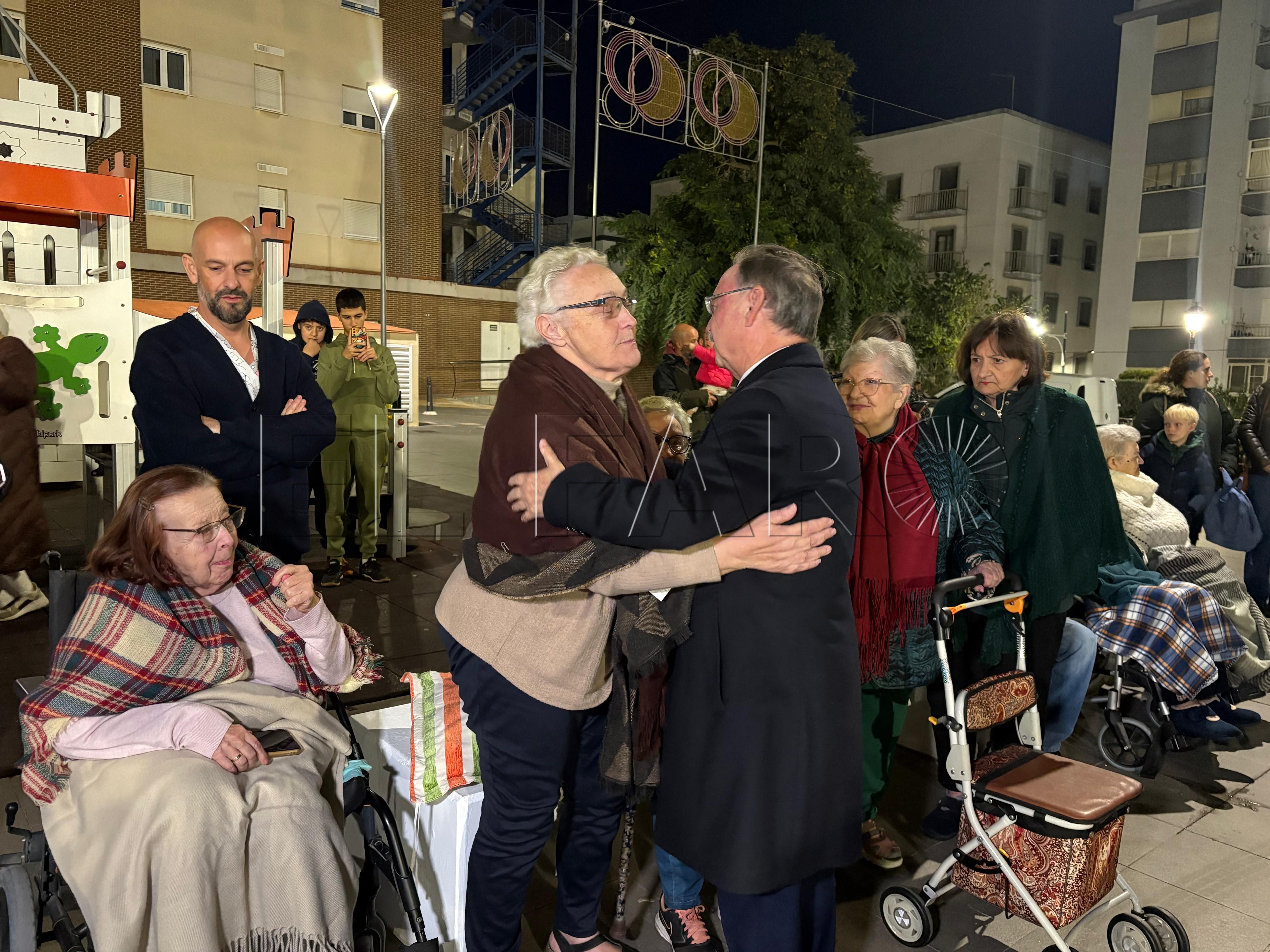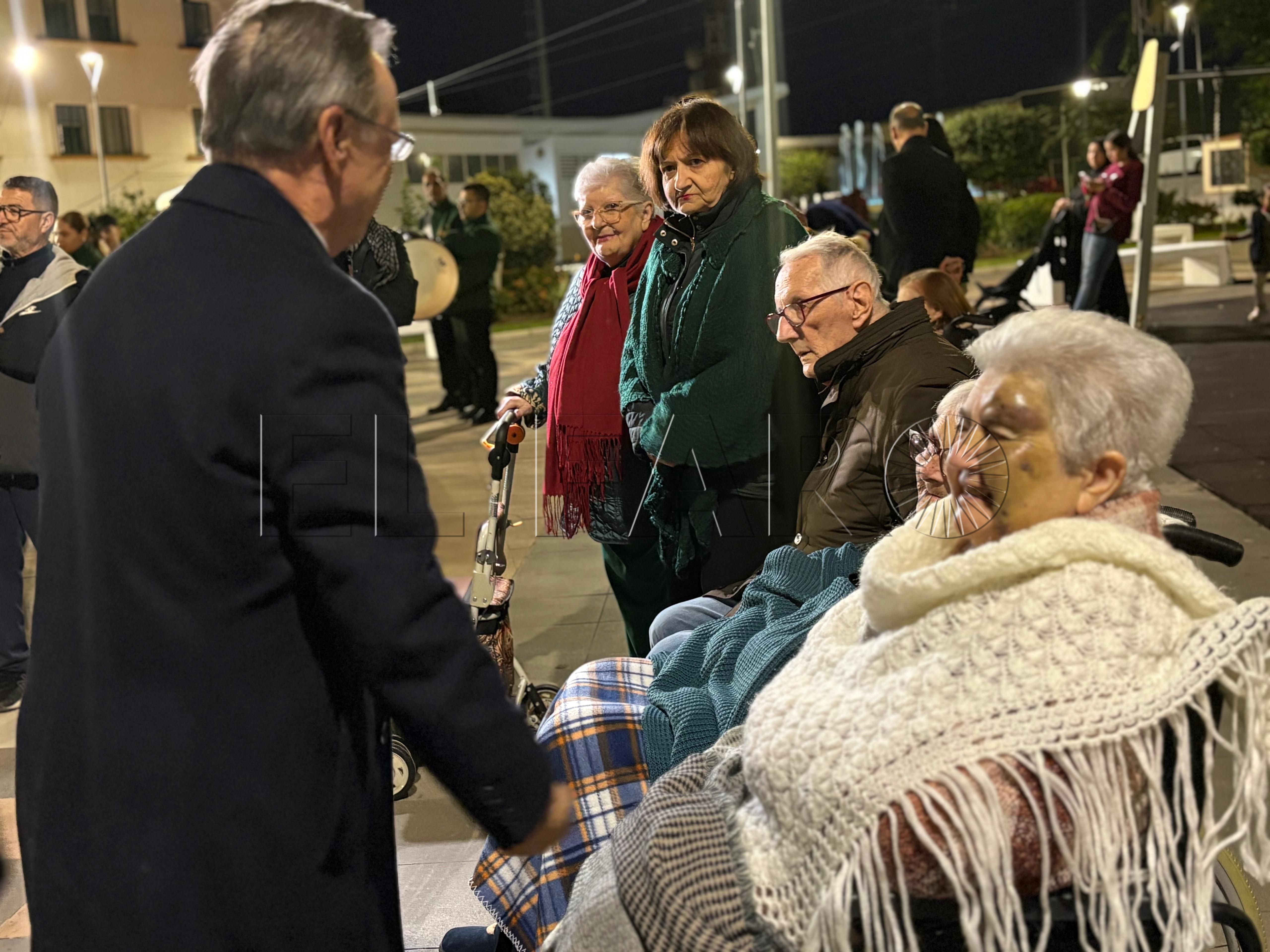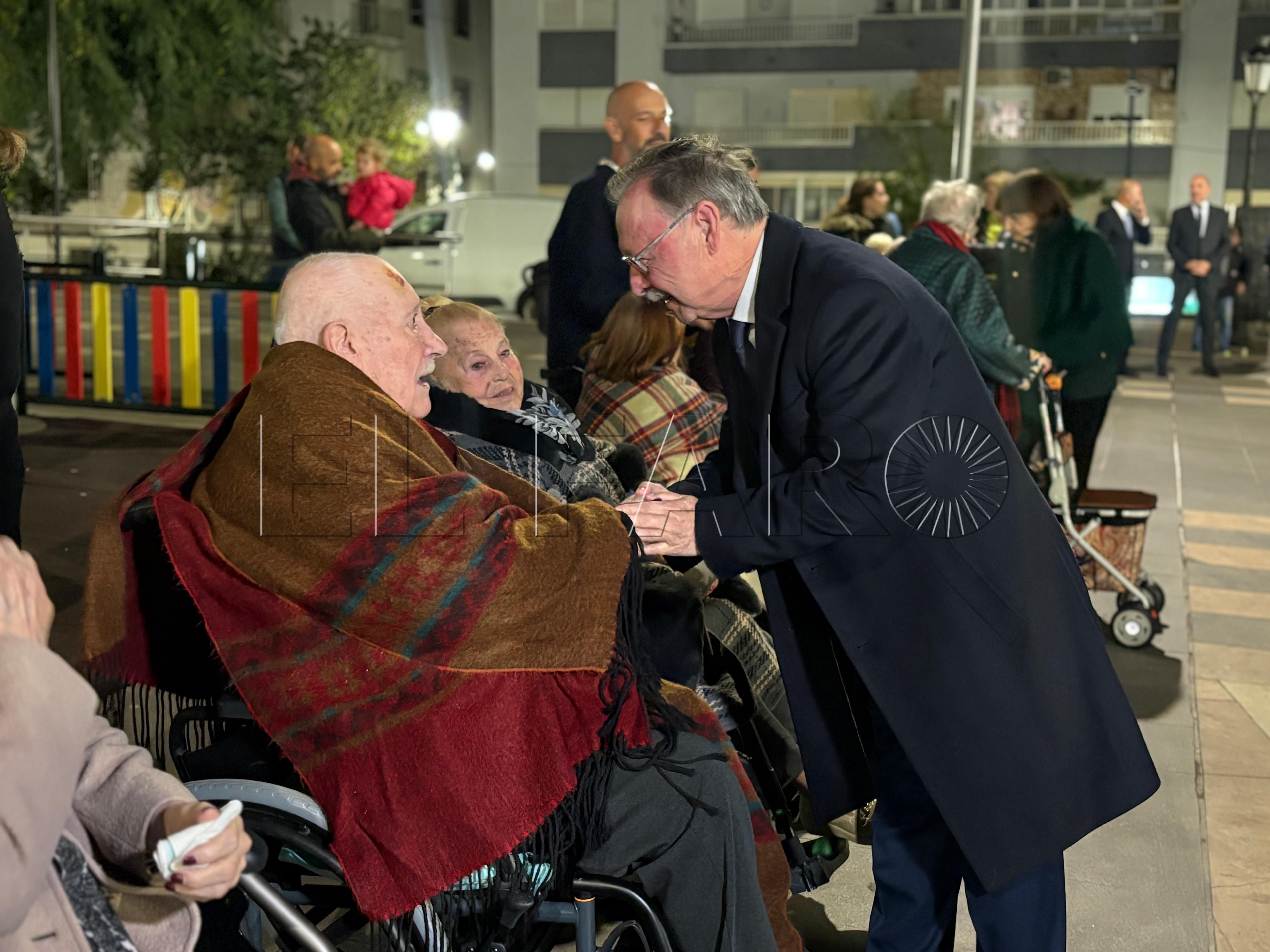 Uno de los momentos más emotivos ha ocurrido poco antes del encendido. El presidente Juan Vivas ha llegado a la plaza unos minutos antes y se ha acercado a saludar a los ancianos de la residencia Virgen de África, que habían sido dispuestos frente al árbol de Navidad instalado en el centro de la plaza.