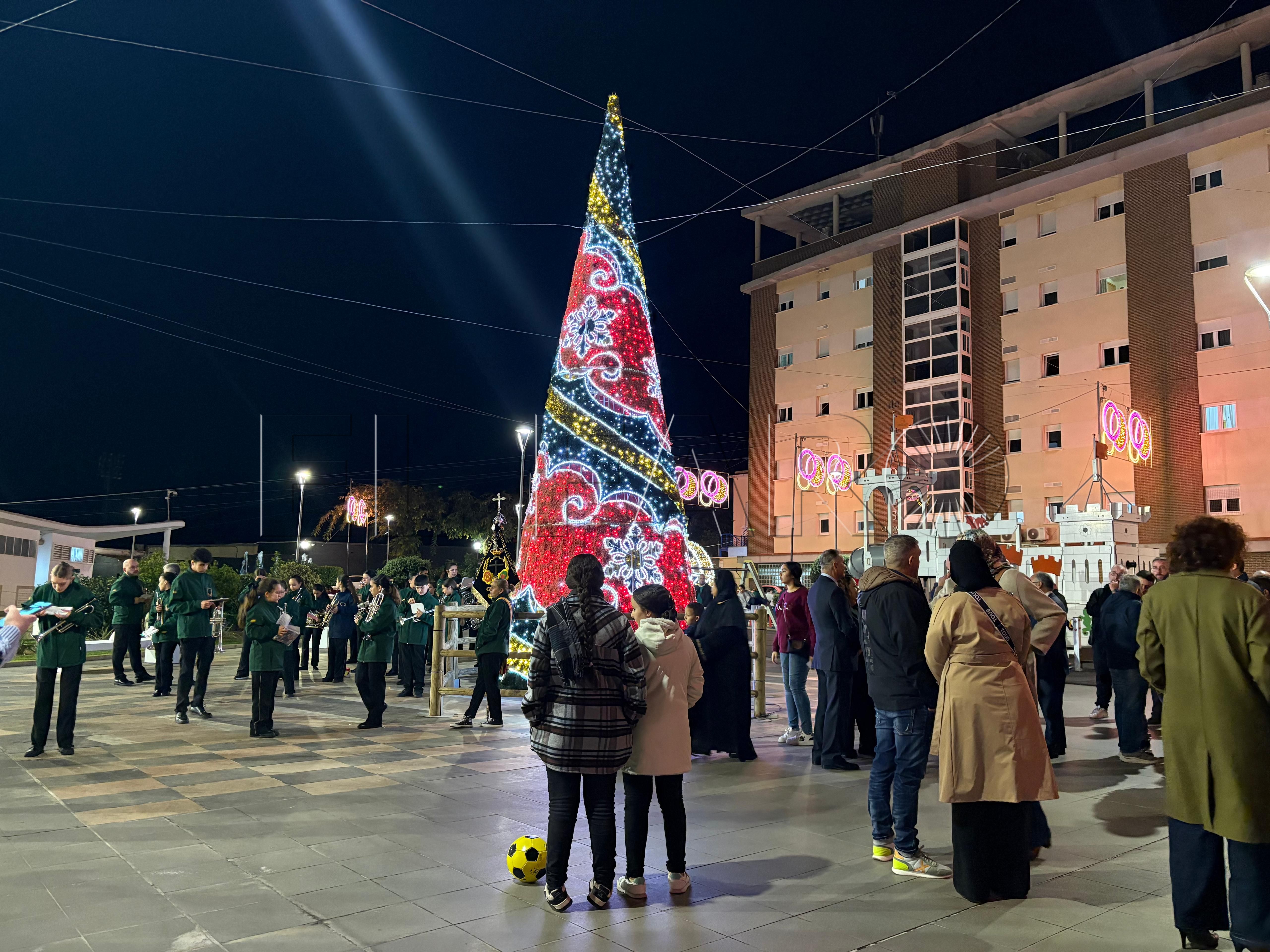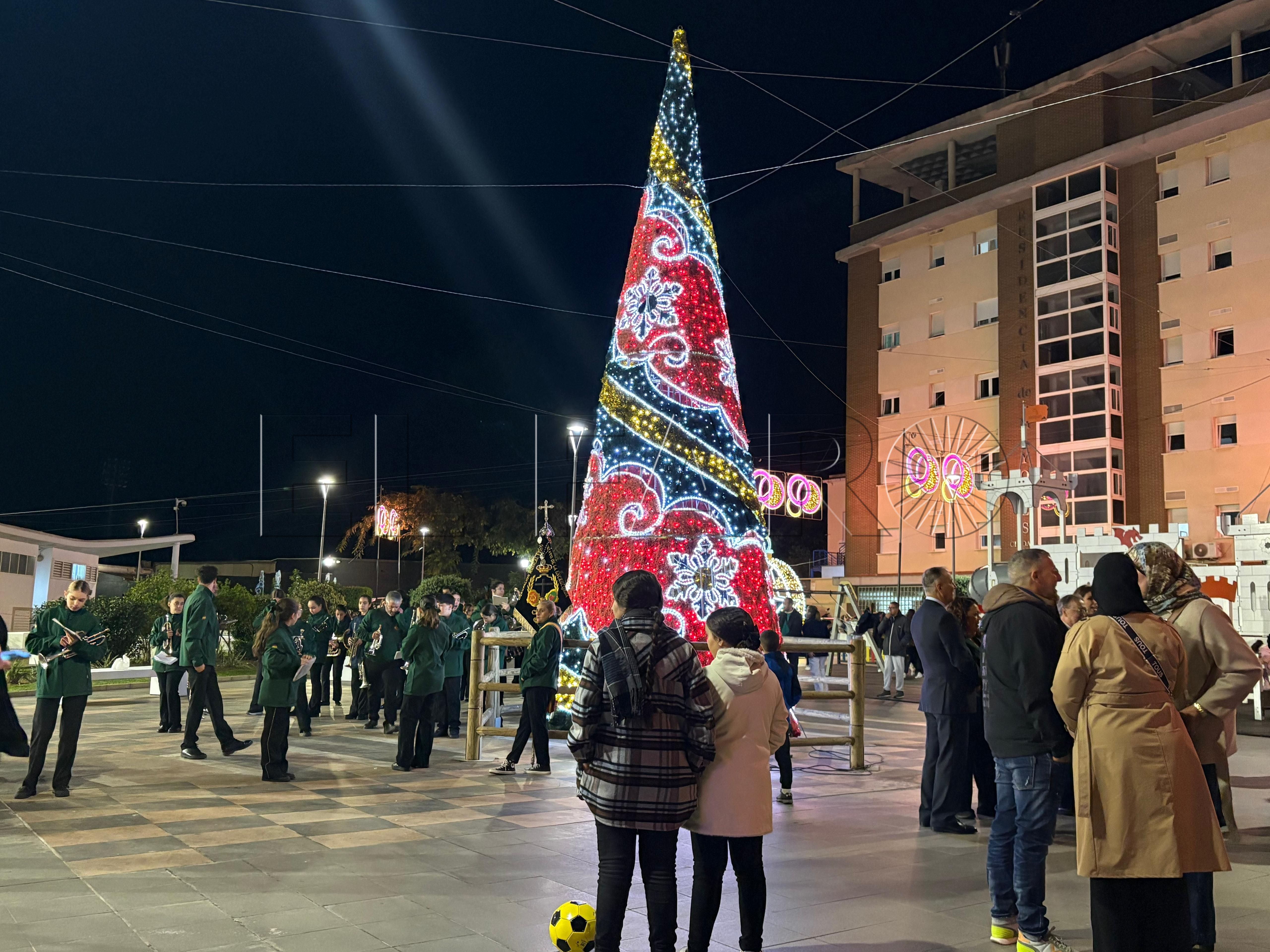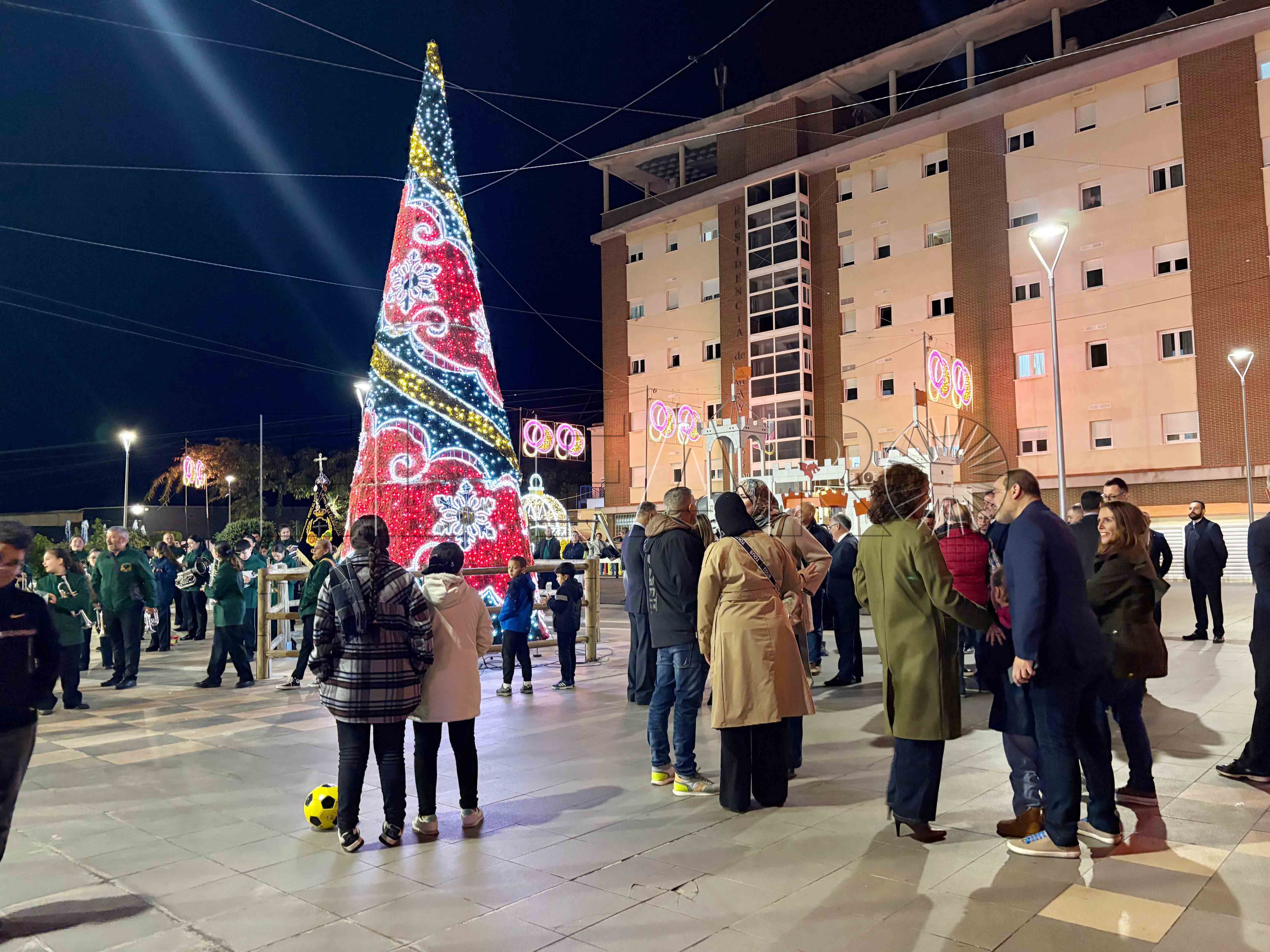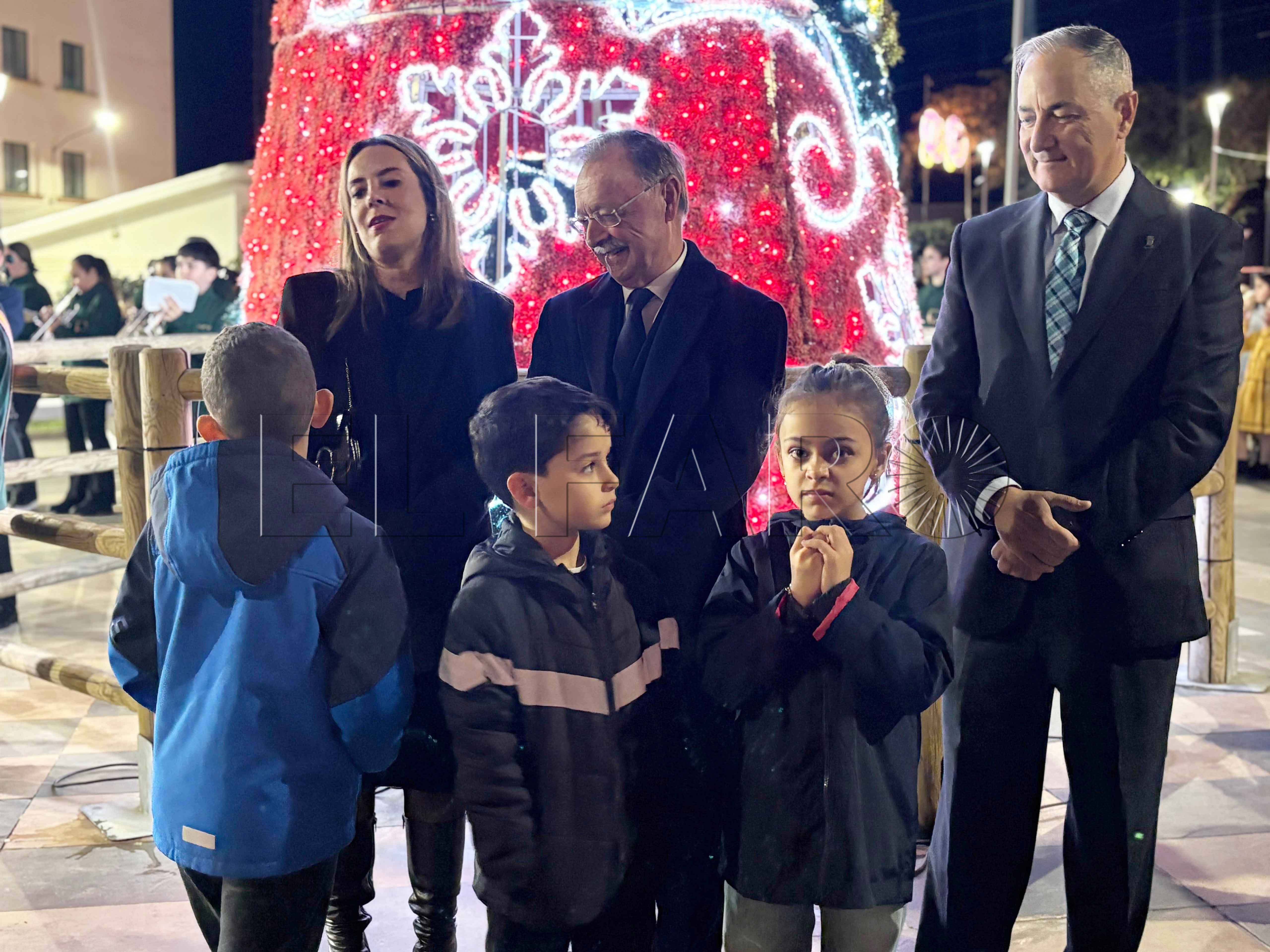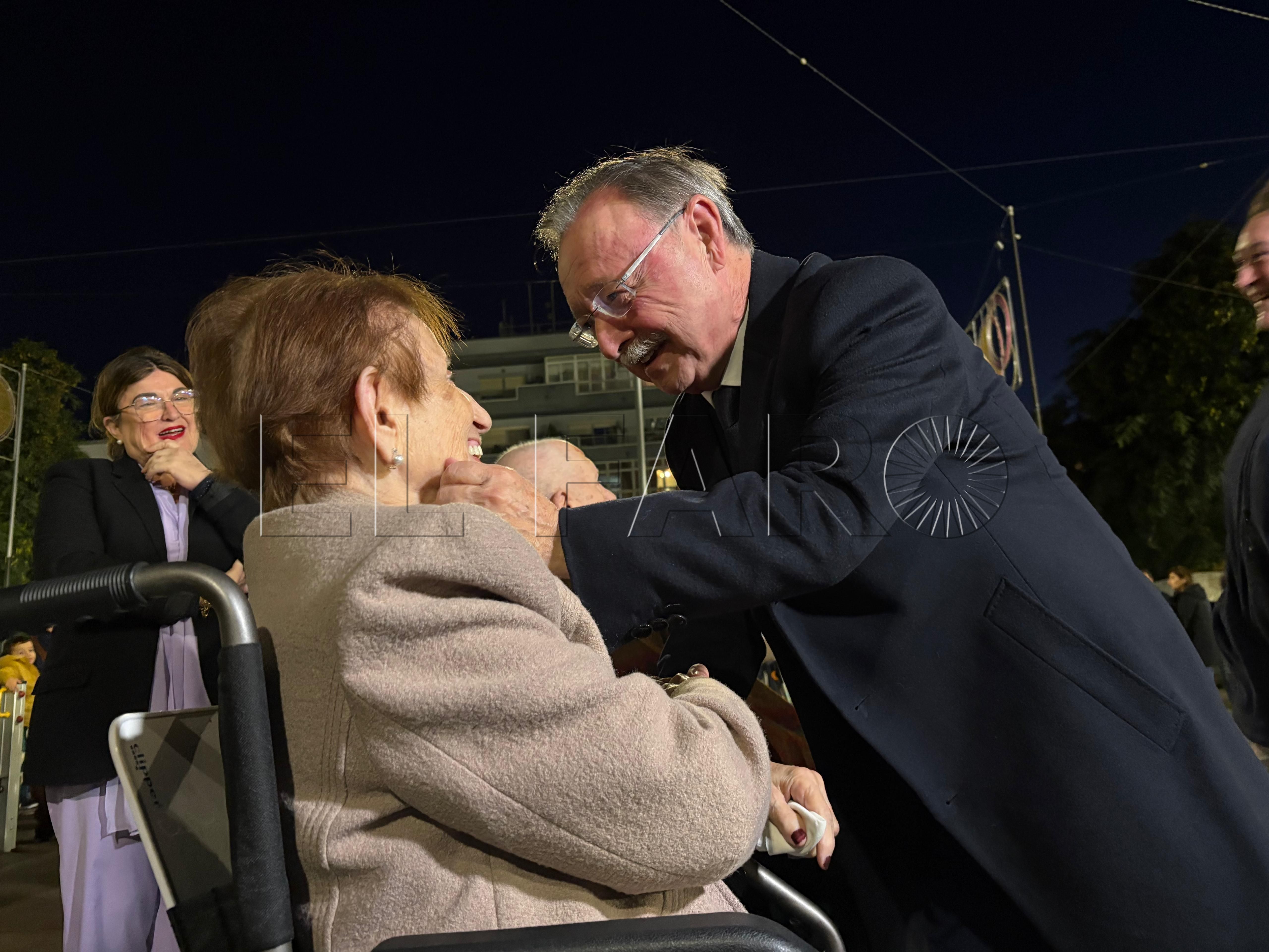 Uno de los momentos más emotivos ha ocurrido poco antes del encendido. El presidente Juan Vivas ha llegado a la plaza unos minutos antes y se ha acercado a saludar a los ancianos de la residencia Virgen de África, que habían sido dispuestos frente al árbol de Navidad instalado en el centro de la plaza.