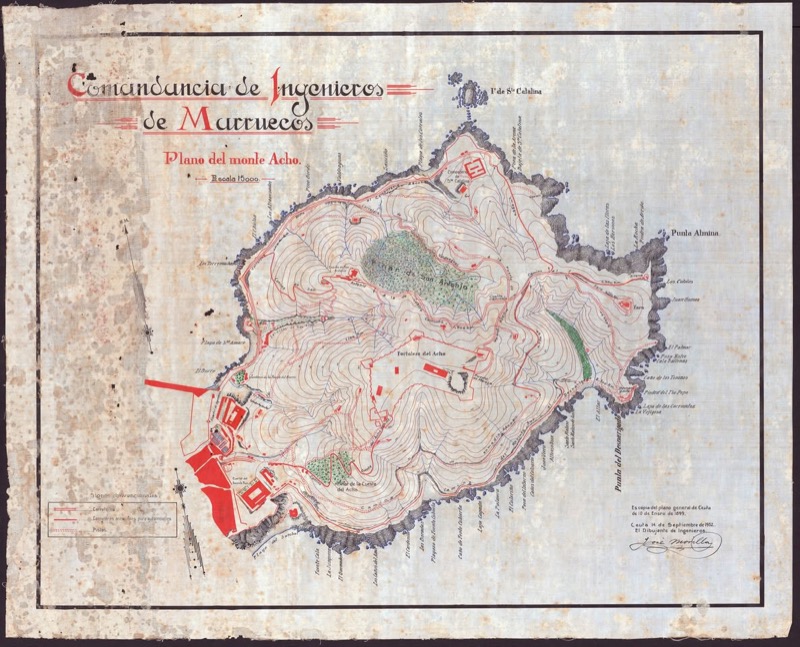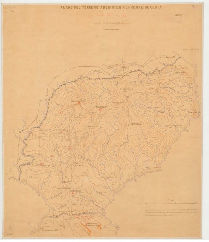 Cuatro años antes, el teniente de ingenieros Enrique Amado confeccionó un gráfico a color nominado ‘plano del terreno adquirido al frente de Ceuta’. Comprende la extensión situada al oeste del istmo que une el peñón del Monte Hacho con el continente africano.