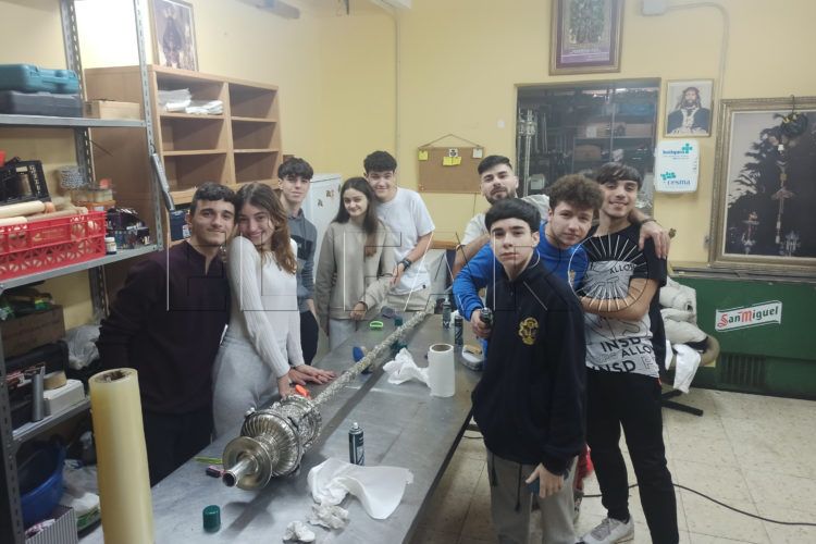 Los jóvenes estaban ambientados en los salones de su casa hermandad con música de marchas procesionales y el típico incienso característico de las procesiones de la Semana de Pasión, mientras se afanaban en poner los enseres a punto.
