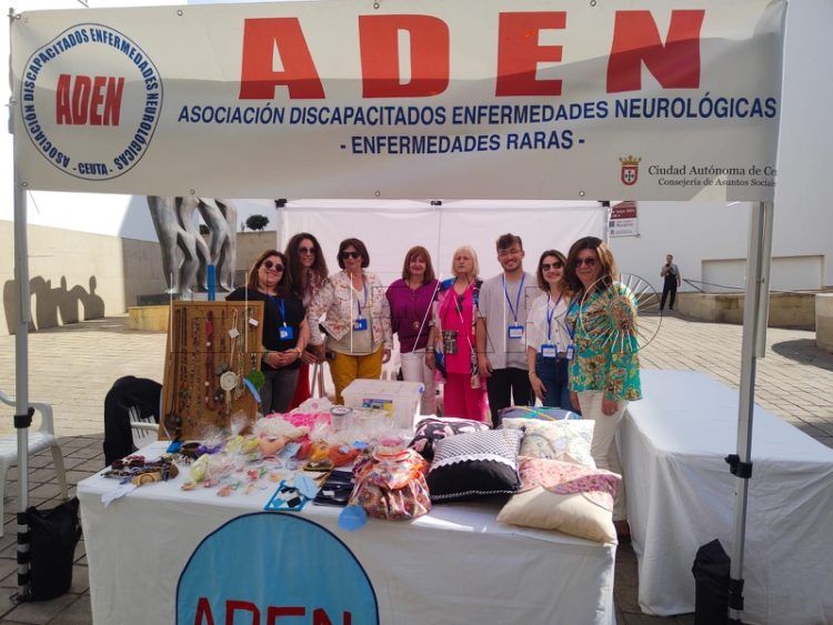 La Asociación de Discapacitados de Enfermedades Neurológicas -Enfermedades Raras- de Ceuta (Aden) ha dispuesto este miércoles en el paseo del Revellín, junto a la plaza Nelson Mandela, un mercadillo solidario para vender las manualidades hechas por los usuarios en sus talleres.