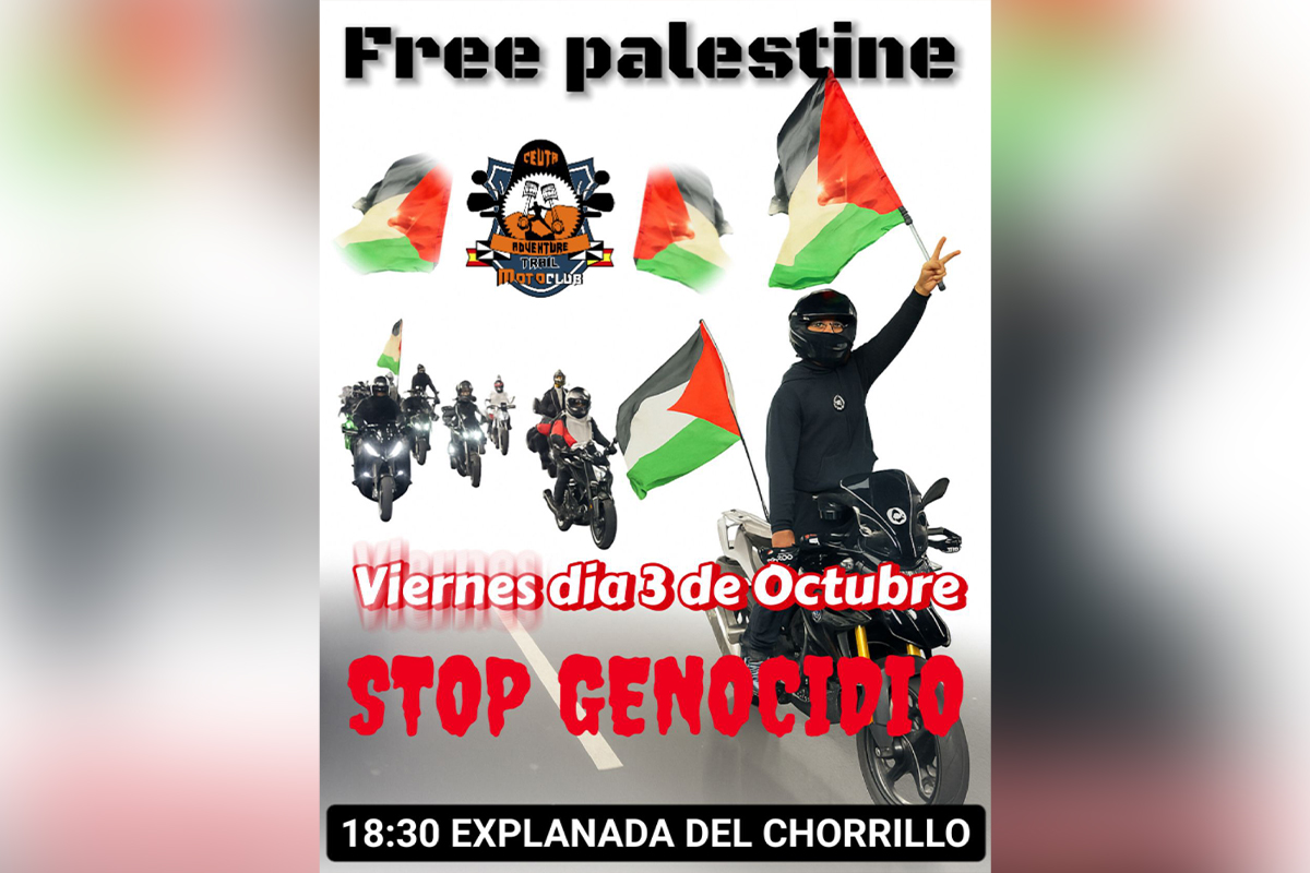 Motoclub Ceuta ha anunciado este lunes la intención de celebrar una ruta por la paz con el objetivo de exigir “el alto el fuego” y el “fin de la violencia en Palestina el próximo 3 de octubre a las 18:30 horas, cuyo lugar de salida será la explanada del Chorrillo.