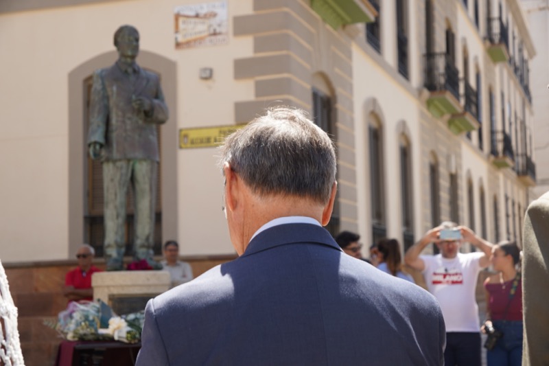 Una admiración ante la estatua, en recuerdo del médico y alcalde fusilado durante la guerra civil española, conflicto que segó muchas vidas, incluyendo la de importantes figuras públicas.