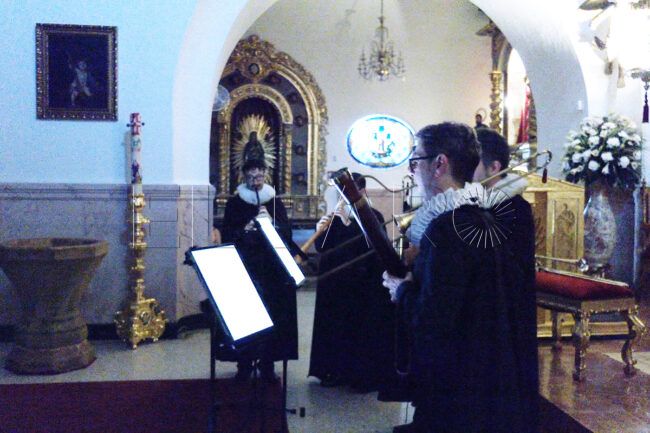 Ataviados con prendas que se remontan a la edad moderna, Ministriles hispalensis ha sido el grupo encargado de dar vida a instrumentos de viento y a su voz. Cantos gregorianos y ritmos con tintes aún del medievo se han expandido por el lugar sacro.