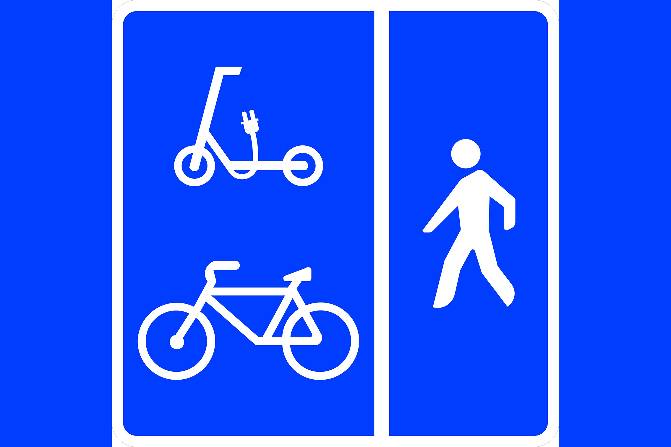 La nueva señal S-43 indica una vía reservada para bicicletas, vehículos de movilidad personal (como patinetes eléctricos) y peatones, con espacios diferenciados para cada grupo. Su diseño en color azul la identifica como señal de información, y se utiliza en tramos urbanos donde estos tres modos de desplazamiento comparten la vía pero con zonas específicas para evitar accidentes.