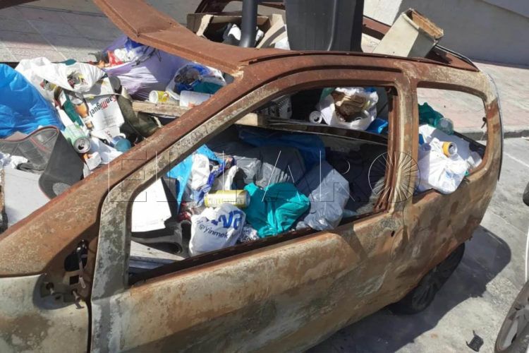 Y ahí, como si se tratase de un contenedor habilitado para echar la basura dentro, se va llenando de bolsas de plástico. Las imágenes muestran cómo se unen en uno mismo dos de los problemas más habituales y acuciantes de la ciudad de Ceuta: la suciedad y la quema de coches. Por si no hubiese suficientes quejas de cada uno de estos problemas por separado.