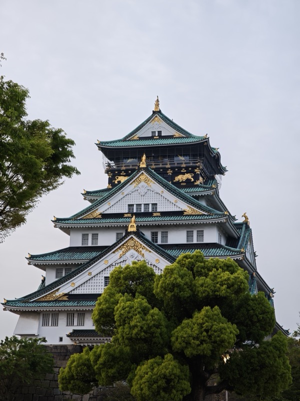 Fuimos a visitar el castillo de Osaka, construido en el siglo XVI, es uno de los tres castillos más importantes de Japón, fue esencial para la unificación del país. Está rodeado de un imponente parque que da oxigeno a la ciudad. Nos impresionó a primera vista, con sus tejas verde jade y los detalles dorados sobre sus inmaculadas murallas blancas. Nos anocheció a las afuera del castillo y paseamos a la tenue luz que nos ofrecía la luna de Abril.
