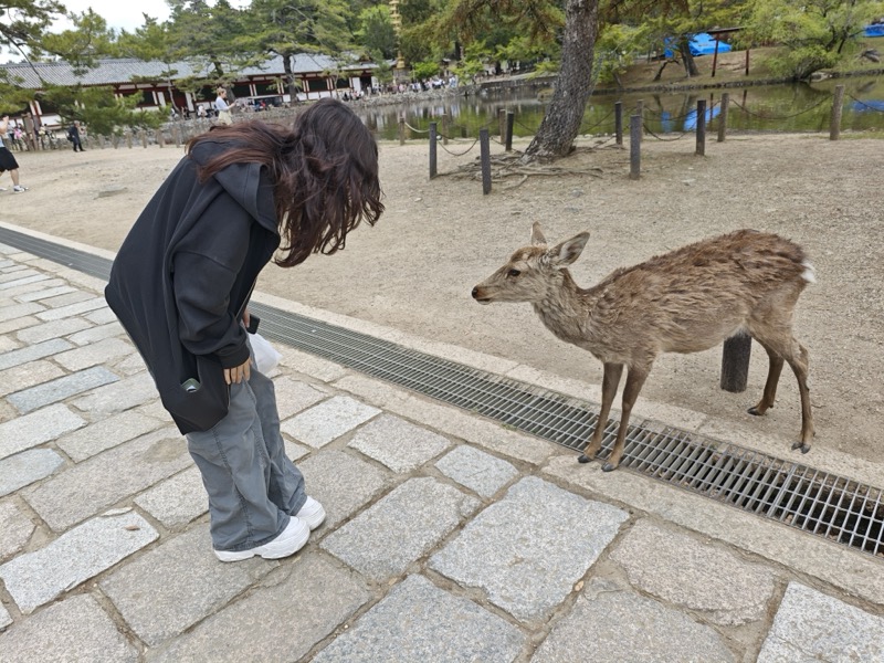 A la salida del gran templo paseamos por el parque con la compañía de los ciervos que hay por doquier en los alrededores. Advertí a mi hija del riesgo de darles de comer, una vez empiezas no te los quitas de encima, te persiguen aunque no te quede comida, la situación fue algo cómica, los dos corriendo tirándoles las galletas a la que están enganchados los familiares de Bambi.
