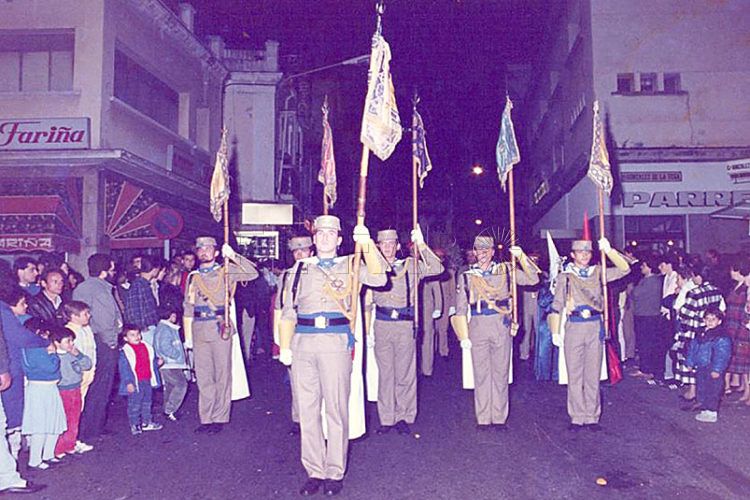 Si bien, durante años precedentes, esta misma unidad desfiló con la Fervorosa y Agustiniana Hermandad de Penitencia y Cofradía de Nazarenos del Santísimo Cristo de la Humildad y Paciencia y Nuestra Señora de las Penas, tal como se refleja en una de las dos imágenes editadas en este texto y que atañe a la jornada del jueves santo del día 13 de abril de 1989, cuyo guion del BIMT. Larache II/54 es portado por quién humildemente expone este pasaje, junto a los banderines pertenecientes al referido Batallón y la Escuadra de Gastadores, Banda de Cornetas, Tambores y Gaitas, del que este Regimiento es Hermano Mayor Honorífico.