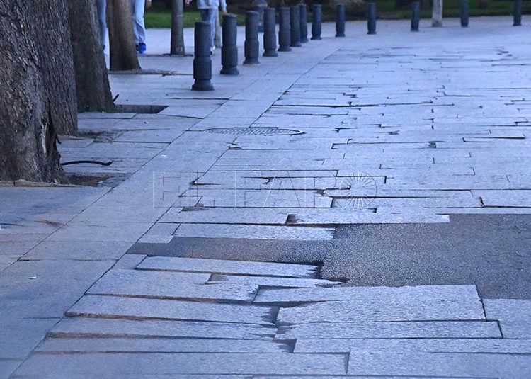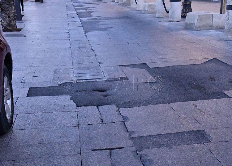 El Paseo de las Palmeras se presenta plagado de boquetes y baldosas sueltas, resultados de un deterioro que comenzó a ser visible hace años y empeoró con el aumento del transporte por esta vía como consecuencia de las obras de Gran Vía y Jáudenes.