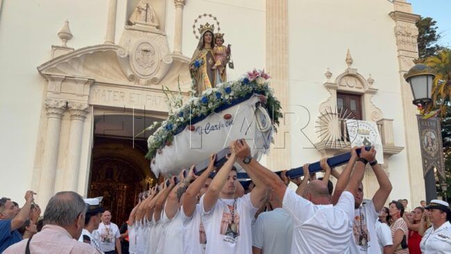 Nuestra querida Virgen de los Mares, salió por el pórtico de la Iglesia de África, donde se leía: Madre y Patrona, en latín, y el Himno Nacional arrancó sus acordes, con los aplausos de la concurrencia, que daba pie a las primeras lágrimas, por ver a esa bella imagen con el niño Jesús. Estaba en una embarcación blanca con la inscripción en la popa de Virgen del Carmen, todos quedamos prendados por la forma como era transportada nuestra veladora de nuestros hombres de la mar, y cuando la banda de música empezó a interpretar la Salve Marinera y todos los que la llevaban, en muestra de gratitud, levantaban sus brazos para ofrecerla a todos los allí presentes fue un jubileo tan grande, que ya nuestras emociones quedaron plasmadas en una oración profunda de gratitud hacia aquellas mujeres y sus valedores que estaban en aquellas andas dando ese cortejo y esas ganas por nuestra querida y amada Virgen del Carmen, y seguía el movimiento y parecía que estaba contando a todos sus hijos presentes, ya que la devoción estaba allí para decirle: "Guapa, guapa, guapa".