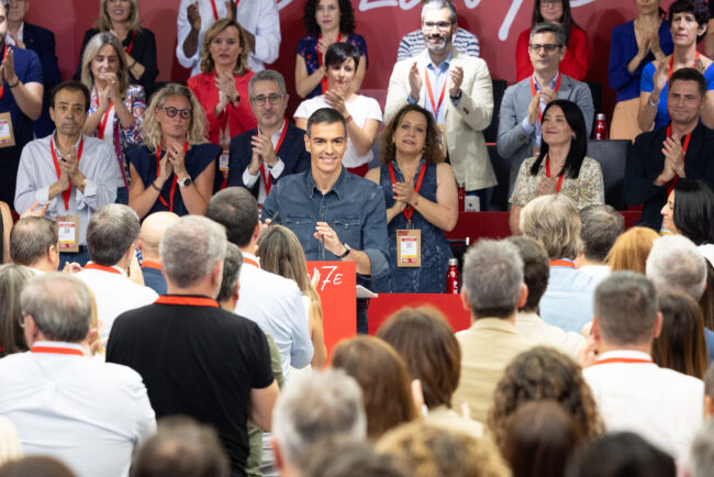 En clave de gobierno, Sánchez ha defendido ser consciente de su deber. “Me elegisteis para ser el capitán del barco. Y el capitán no se desentiende cuando viene mala mar. Se queda a capear el temporal, salvar el rumbo y ganar el puerto”. El secretario general vaticina más años de avances y derechos, hasta las próximas elecciones en 2027 y después si los españoles quieren. “Creemos en un proyecto político que han apoyado millones de personas, que está dando sus frutos de forma excepcional, y del que depende el futuro de nuestro país”. Sánchez ha defendido que el Gobierno socialista es un faro de esperanza en el mundo gracias a decisiones como no aumentar el gasto en Defensa al 5% del PIB.
