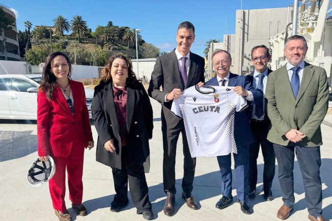 Pedro Sánchez, que ha conocido la nueva terminal marítima de Ceuta durante su cuarta visita a la ciudad y la subestación Virgen de África, ha posado con la camiseta y Juan Vivas. Ambos presidentes sosteniendo la elástica y sonrientes, acompañados, entre otros, por el presidente del Puerto, Juanma Doncel, otro fiel seguidor del club.