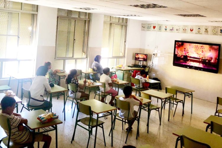 Una mañana de película. El Centro de Educación Infantil y Primaria (CEIP) Ramón y Cajal ha acogido a un grupo niños que han podido disfrutar de una actividad organizada por el voluntariado de Cruz Roja Juventud, como parte de una iniciativa con la que cada año realizan un cinefórum en los colegios y en las barriadas donde sea posible.