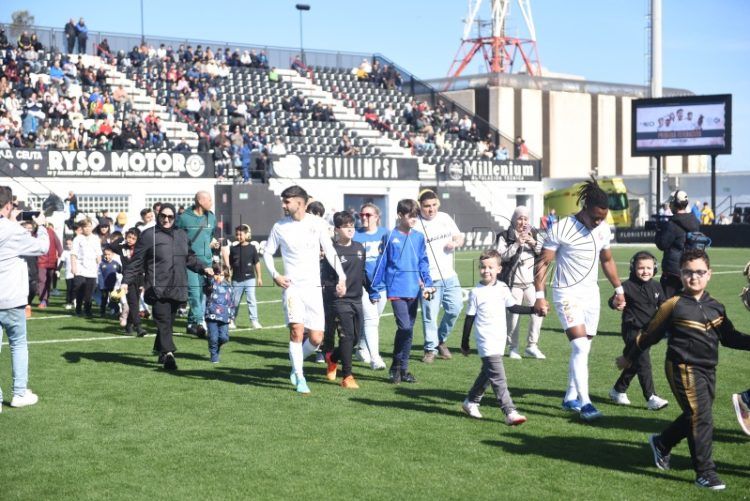 Pero esto no ha sido lo único, pues los niños también han salido de la mano de los jugadores del Ceuta al césped del Estadio Alfonso Murube para marcar el inicio del partido y darle suerte al equipo.