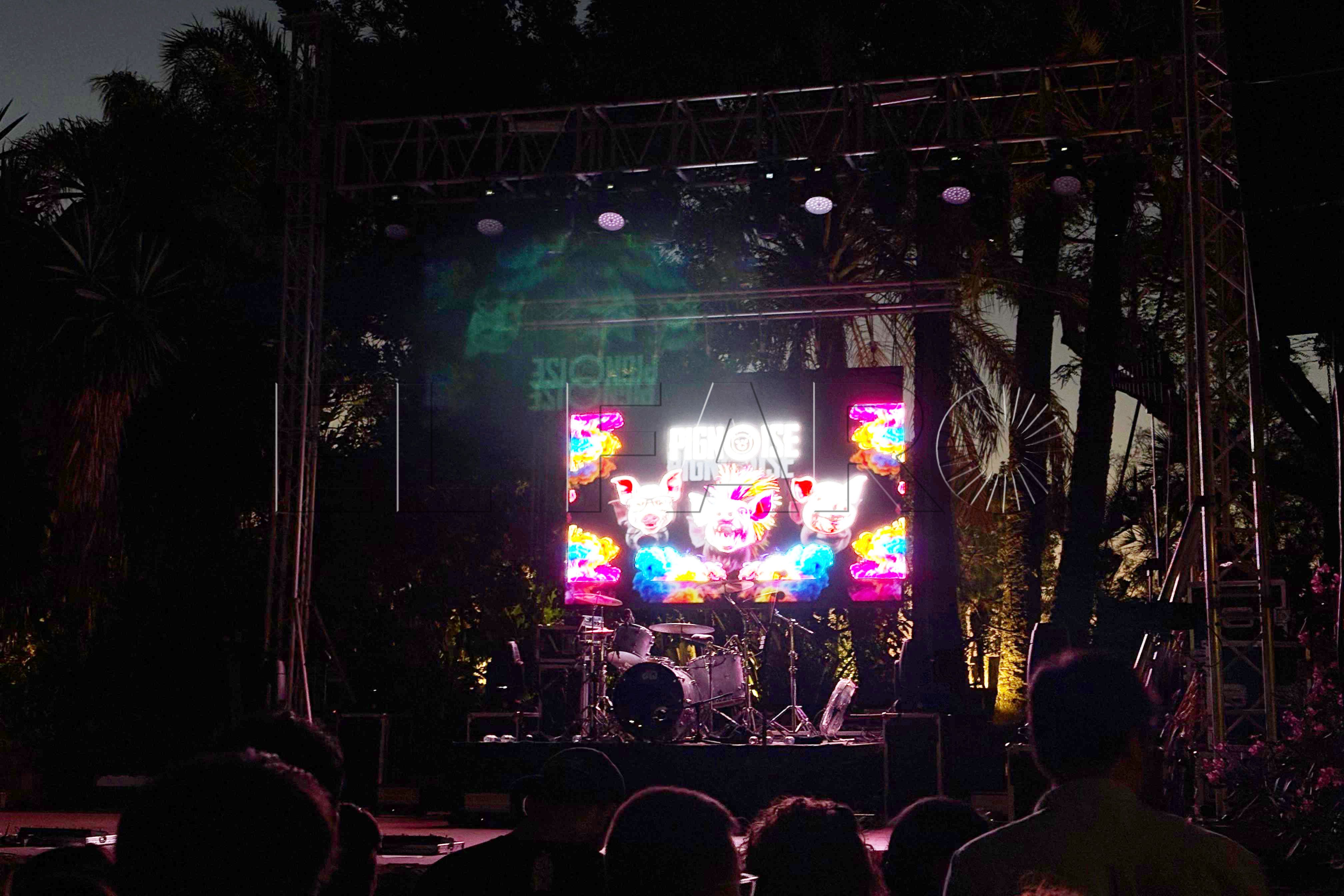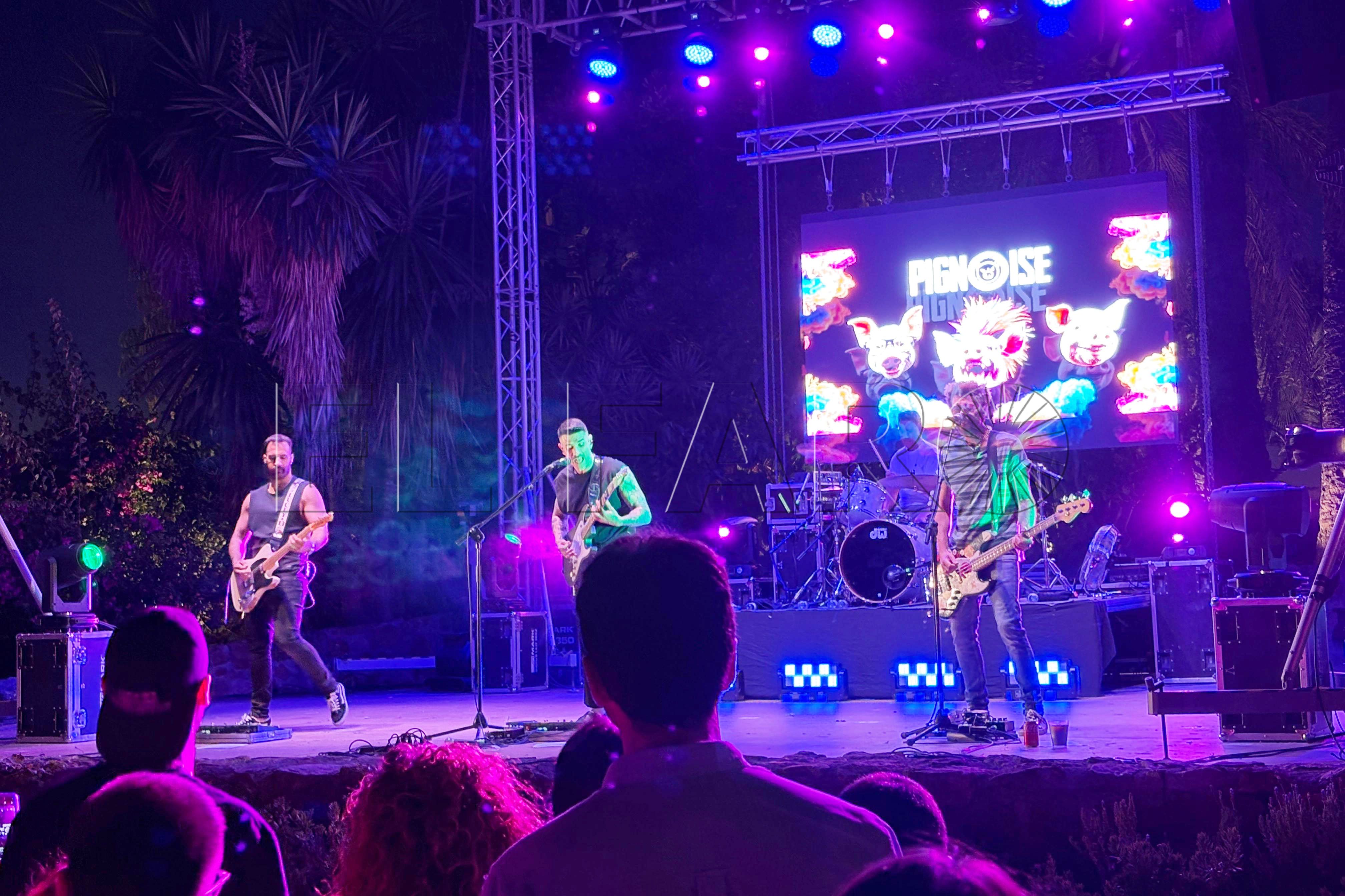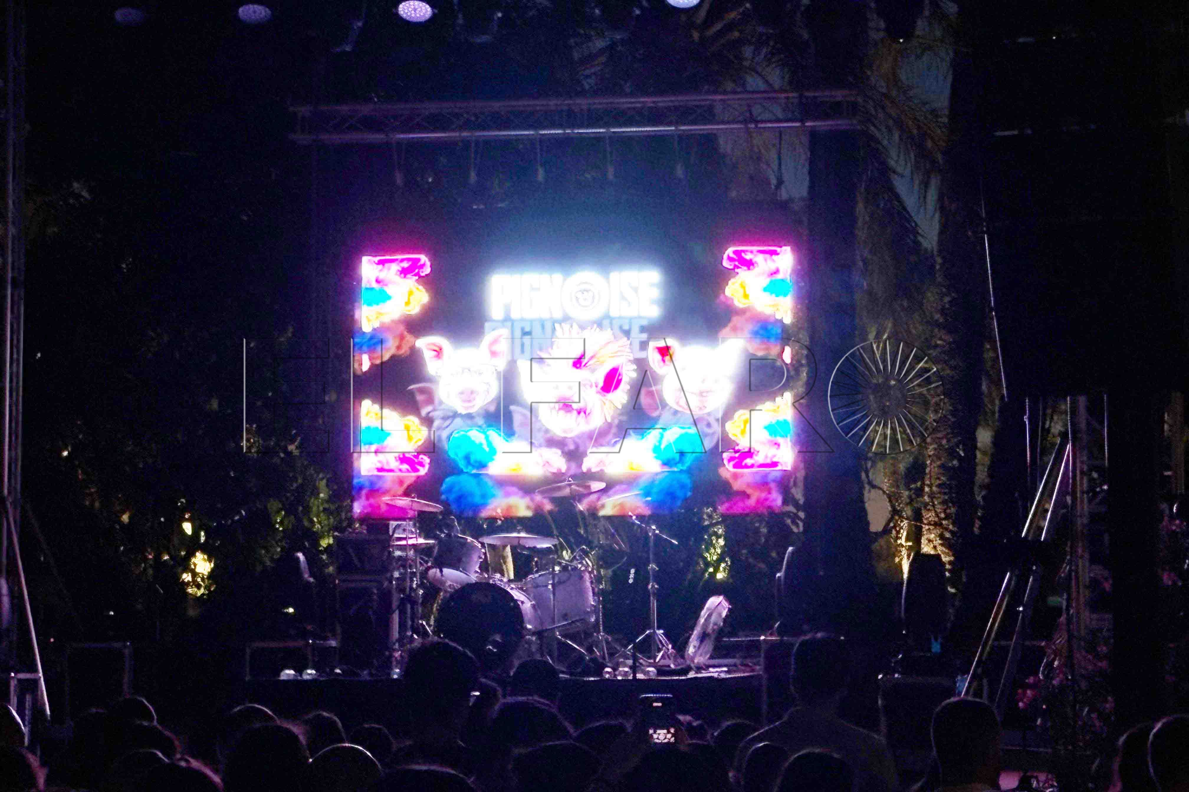 Mientras el concierto comenzaba, la música ambiente animaba a los asistentes y una pantalla donde se podía leer Pignoise dejaba claro el grupo que pasaría esta noche de verano por el escenario del Parque Marítimo del Mediterráneo.