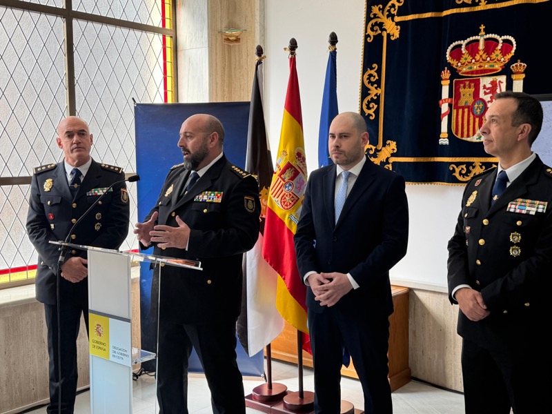 El jefe la UDYCO central, Antonio Martínez Duarte, ha comparecido este martes en la Delegación del Gobierno rodeado de la cúpula de la Jefatura Superior de Ceuta y de los investigadores que han logrado dar con una trama encargada del tráfico de drogas a gran escala nacional e internacional.
