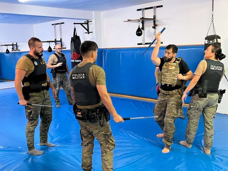 Ejercicios en los que, ataviados con camiseta, chaleco antibalas y una suerte de defensa extensible, mejoran su técnica de uso de esta herramienta, así como las formas de repeler un intento de ataque, reduciendo a la figura hostil.