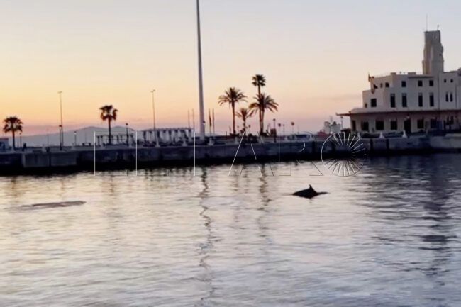 Es común ver a los delfines por las costas de la bahía norte y sur cruzando el Estrecho, pero también se les ha visto por la parte trasera del Parque Marítimo o en este punto más próximo al puerto deportivo.
