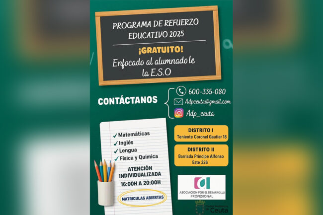 La Asociación por el Desarrollo Profesional (ADP) consolida en Ceuta el Proyecto Socioeducativo 2025, una iniciativa puesta en marcha en enero de este año que tiene como objetivo ofrecer apoyo académico y formación integral a niños y jóvenes de Educación Secundaria Obligatoria (ESO) en situación de vulnerabilidad social y económica.