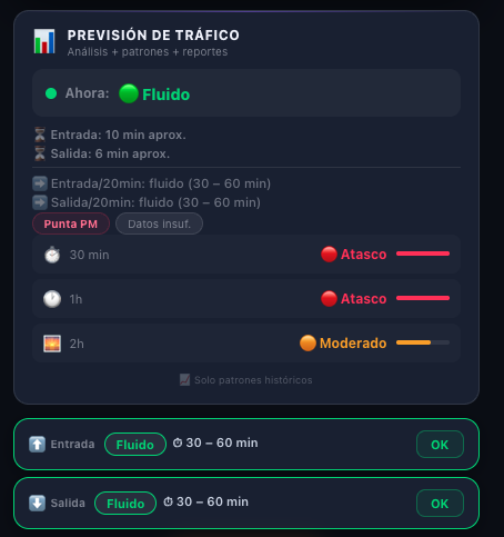 - El verde indica tráfico fluido (30-60 minutos de espera)