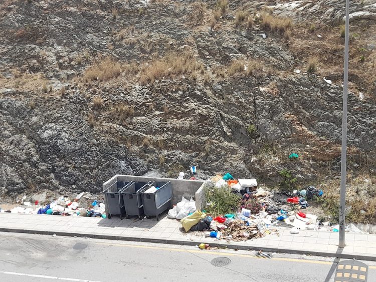 Junto a los tres depósitos de basura, en el suelo, se observa como todos los desechos se amontonan sobre el acerado en lugar de quedar en el interior de los contenedores. Sin embargo, estos siguen prácticamente vacíos, y es el pavimento de los alrededores sobre el que, finalmente, quedan los escombros. "La basura ya está llegando a la carretera", señalaba esta vecina en declaraciones a El Faro de Ceuta.