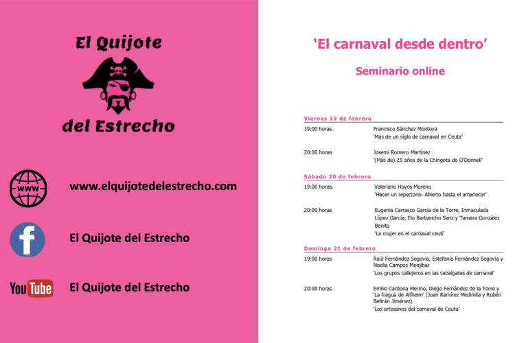 Carnavaleros de la ciudad participarán el próximo fin de semana en el seminario online ‘El carnaval desde dentro’, que será emitido en directo a través de la página de Facebook ‘El Quijote del Estrecho’ y el canal de YouTube, además de en la página www.elquijotedelestrecho.com, conducido por un carnavalero reconocido en la ciudad como es Juanmi Armuña.