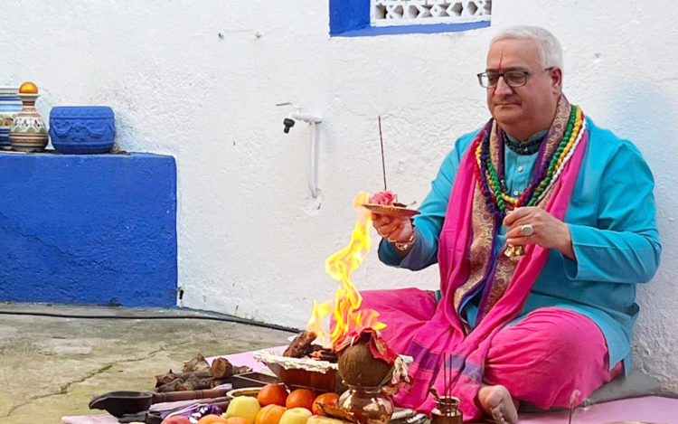 Sentados en el patio extremeño-andaluz de la escuela que dirige el famoso bailarín y coreógrafo Andrés Malpica, resonaron mantras védicos, se hicieron ofrendas de ghee (mantequilla clarificada), madera, especias y raíces aromáticas, todo llevado a cabo con gran atención por parte del público que presenciaba uno de los rituales más antiguos de la humanidad y que todavía está muy vigente dentro de la religión hindú.