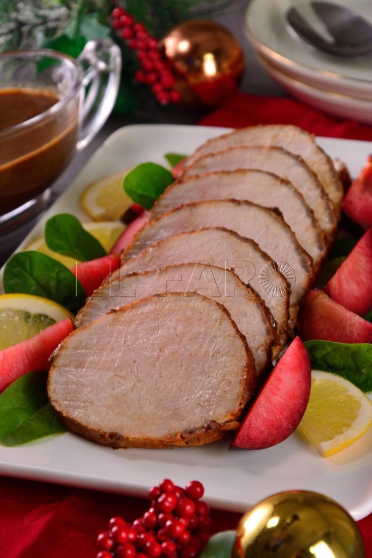 Licúa la preparación anterior hasta obtener una salsa tersa. Vierte sobre el lomo, tapa con papel aluminio y hornea alrededor de 40 minutos, bañando de vez en cuando con la salsa. Destapa el lomo y hornea 10 minutos más. Reposa 10 minutos antes de cortar y sirve con la salsa.