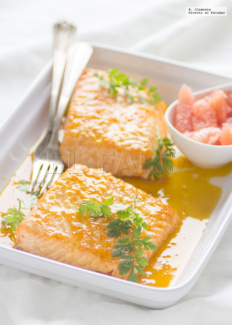 La preparación del pescado se hace al horno y simplemente después se salsea, por lo que el salmón queda en el punto que queramos y no se reseca al no ir cocido en la salsa. Ingredientes (Para 4 personas): 4 lomos de Salmón fresco 2 Pomelo rosa 1 Naranja 10 g Jengibre fresco 2 cucharadas de Sirope de arce 20 g Mantequilla Sal y pimienta al gusto