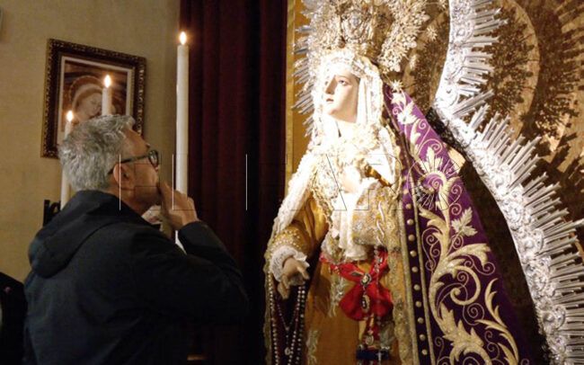 Velas, candelabros, rosarios y alfombra larga para dar la bienvenida a todo el que entra solo para visitarle y para hacer este gesto de respeto. El culto se presenta para la hermandad como uno de los últimos trabajos antes de la llegada de la procesión y del inicio de la Semana Santa.