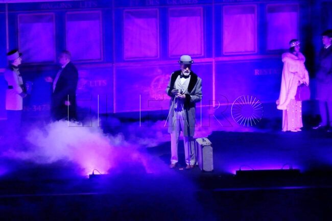 Seguidamente, el escenario se iluminó y sobre él aparecieron los actores de la obra junto a una recreación de los vagones del Orient Express de grandes dimensiones.