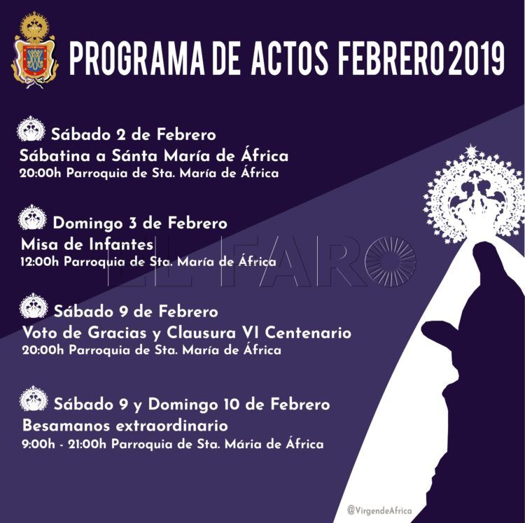 El domingo se ha convocado, a las 12.00 horas, en la parroquia de África una misa de infantes. El sábado 9 de febrero se ha contemplado la celebración, a las 20.00 horas, de un voto de gracias y clausura del VI Centenario. Para completar la agenda, tanto ese sábado como el domingo día 10 se celebrará un besamanos extraordinario desde las 9.00 hasta las 21.00 horas en templo de la Patrona.