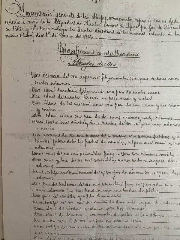 Preguntado por la calidad y número de alhajas robadas, dijo que, para responder con exactitud, necesitaba ver las que la Imagen tenía colocadas. Practicada esta diligencia, declaró que las robadas eran: Un peto que contenía unas pulseras de oro con esmeraldas, unos zarcillos con esmeraldas y perlas alrededor; un alfiler de pecho igual: otros zarcillos de plata con puntas de diamantes y otras varias alhajas de distinto valor.