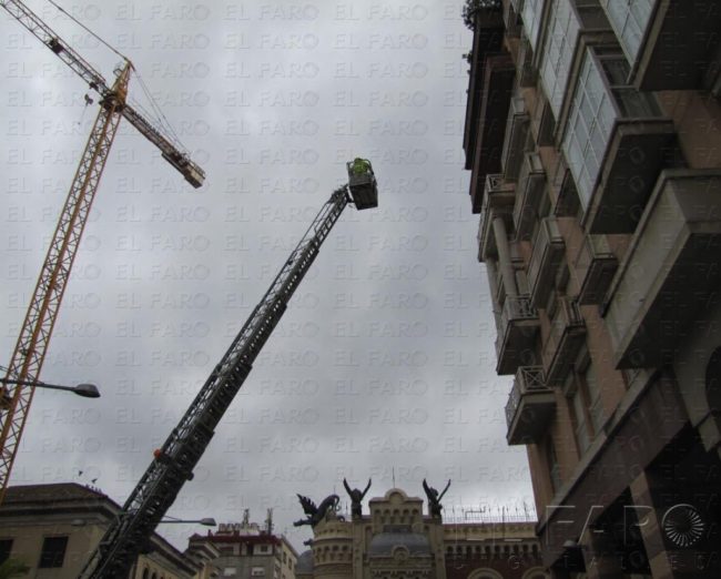Intenso trabajo el que tuvo en la lluviosa y ventosa jornada de ayer el Servicio de Extinción de Incendios y Salvamento (SEIS) que tuvieron una decena de salidas. Entre ellas, además de la mencionada en la información principal de la presente página, cabe destacar la que aconteció a las 13:00 horas en la Plaza de los Reyes, donde de una cornisa de un inmueble se desprendió haciendo caer distintos cascotes, sin que, por fortuna, hubiera que lamentar daños personales. Bomberos arregló la situación y la calma regresó al concurrido enclave de la ciudad. También Bomberos actuó en dos inundaciones, una en Juan XXIII y otra en Loma Margarita, donde se colapsaron dos arquetas.