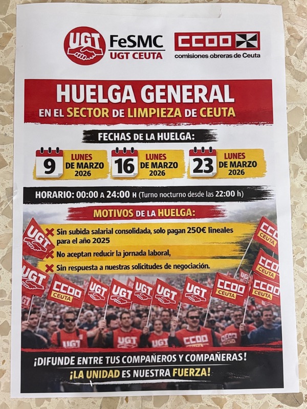 Las protestas se enmarcan en la lucha del sector por la negociación del Convenio de Limpieza de Edificios y Locales de Ceuta, que, según denuncian las centrales sindicales, permanece bloqueado desde 2024.