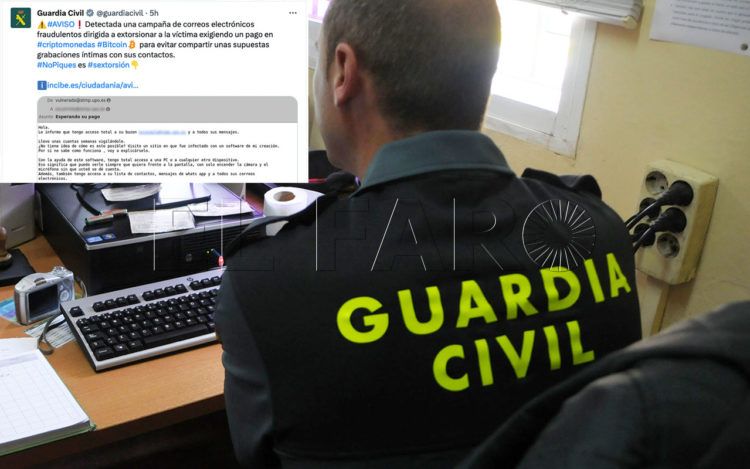 “¡No piques, es sextorsión!”. Con esta frase la Benemérita advierte que ha sido detectada “una campaña de correos electrónicos fraudulentos dirigida a extorsionar a la víctima exigiendo un pago en criptomonedas (Bitcoin) para evitar compartir unas supuestas grabaciones íntimas con sus contactos”.